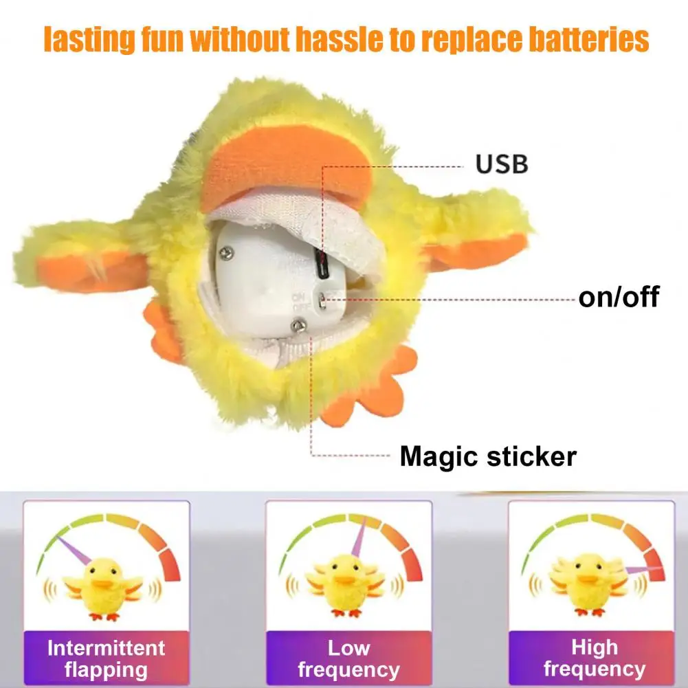 Introducing the flapping duck toy Interactive Cat Toy, featuring three modes of flapping wings to cater to your cat's varying interests. Your indoor kitty will be delighted with this Cat-Duck Toy, feeling like they've caught a real duckling as they proudly hold it in their mouths or toss it into the air. The rechargeable feature makes it easy to use – simply turn the switch to "on" and watch the lively toy come to life with realistic sounds and wing flapping action. Enhance playtime by adding catnip for extra excitement.