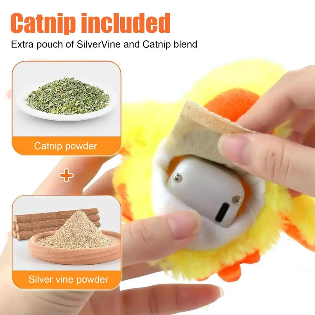 Catnip Compatibility: Enhance your cat's play experience by adding catnip to the flapping duck toy. Flapping Bird Cat Toys for Indoor Cats Adding extra bags of catnip can be a great addition to make playtime fun for your cat.