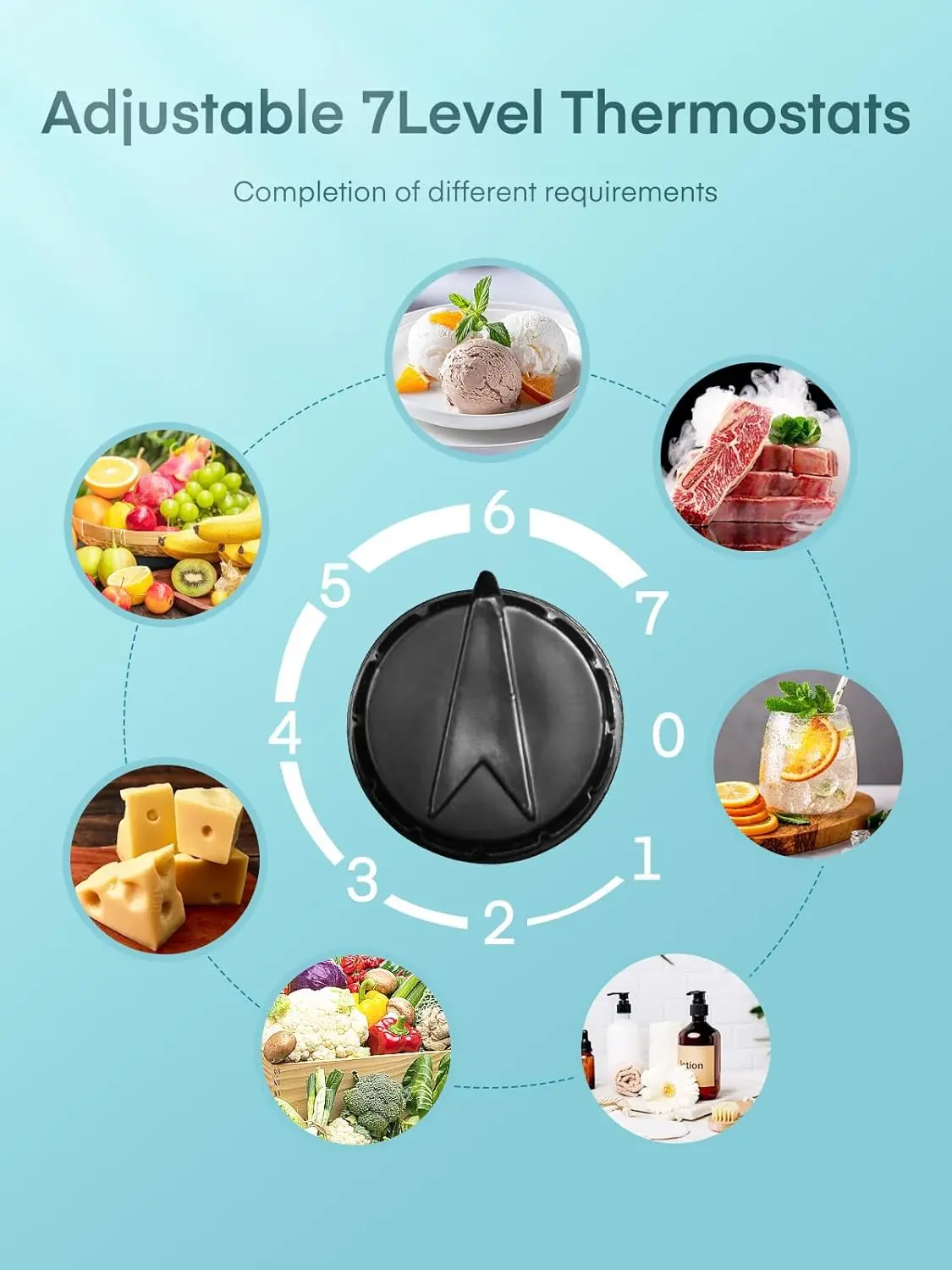 • 【Suitable for Every Season】Our mini refrigerator with freezer has 7 levels of temperature control. In different seasons, you can adjust to different temperature levels to perfectly achieve food storage temperature conditions and avoid excessively high or low temperatures that may cause food damage.