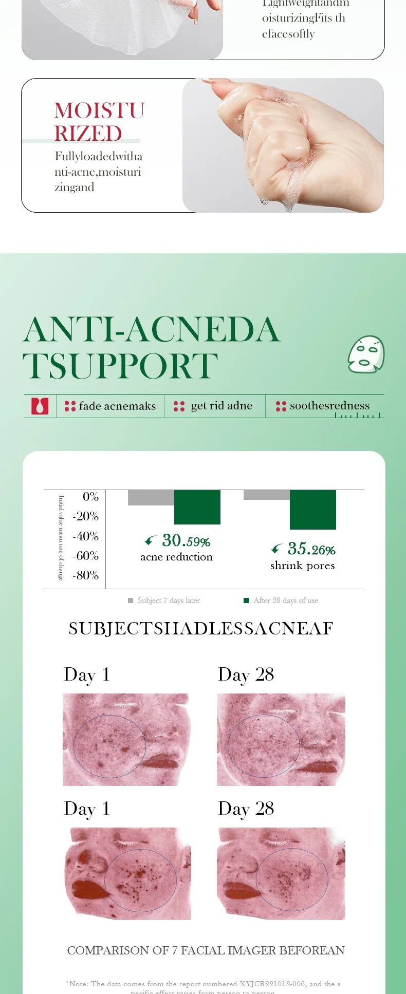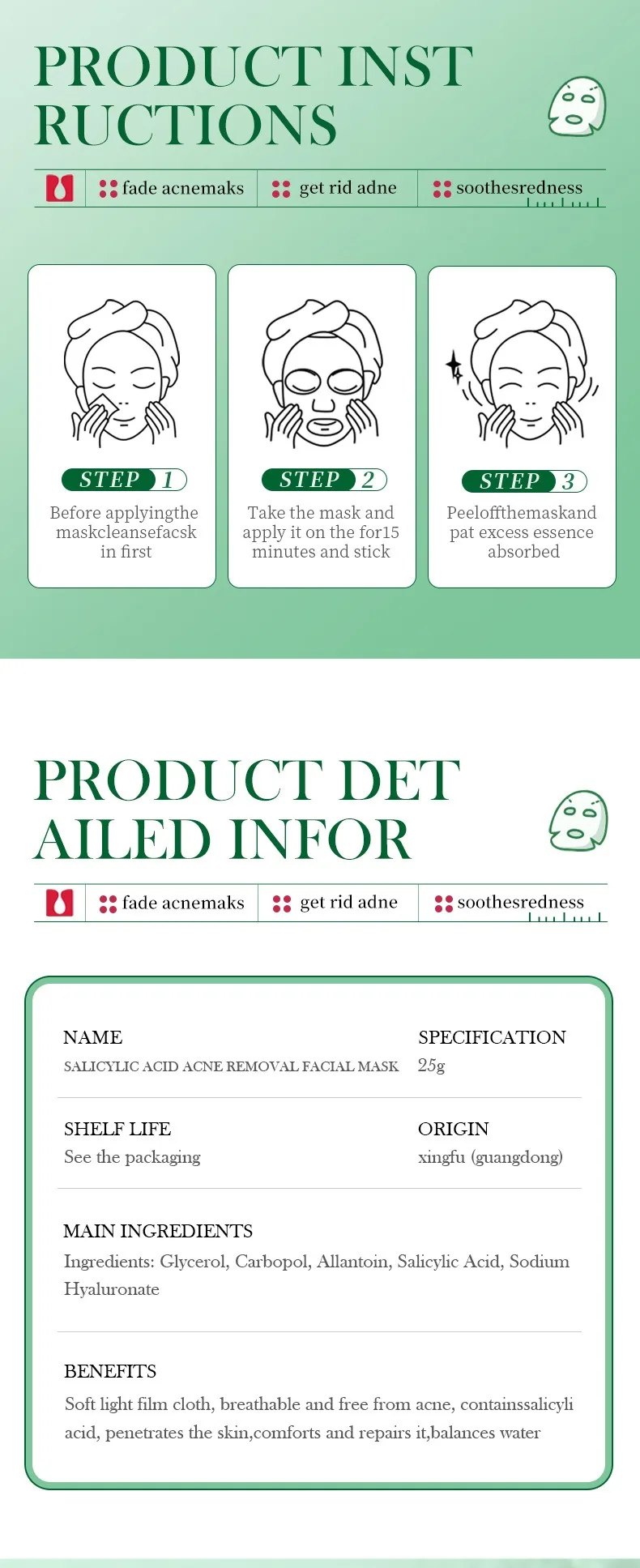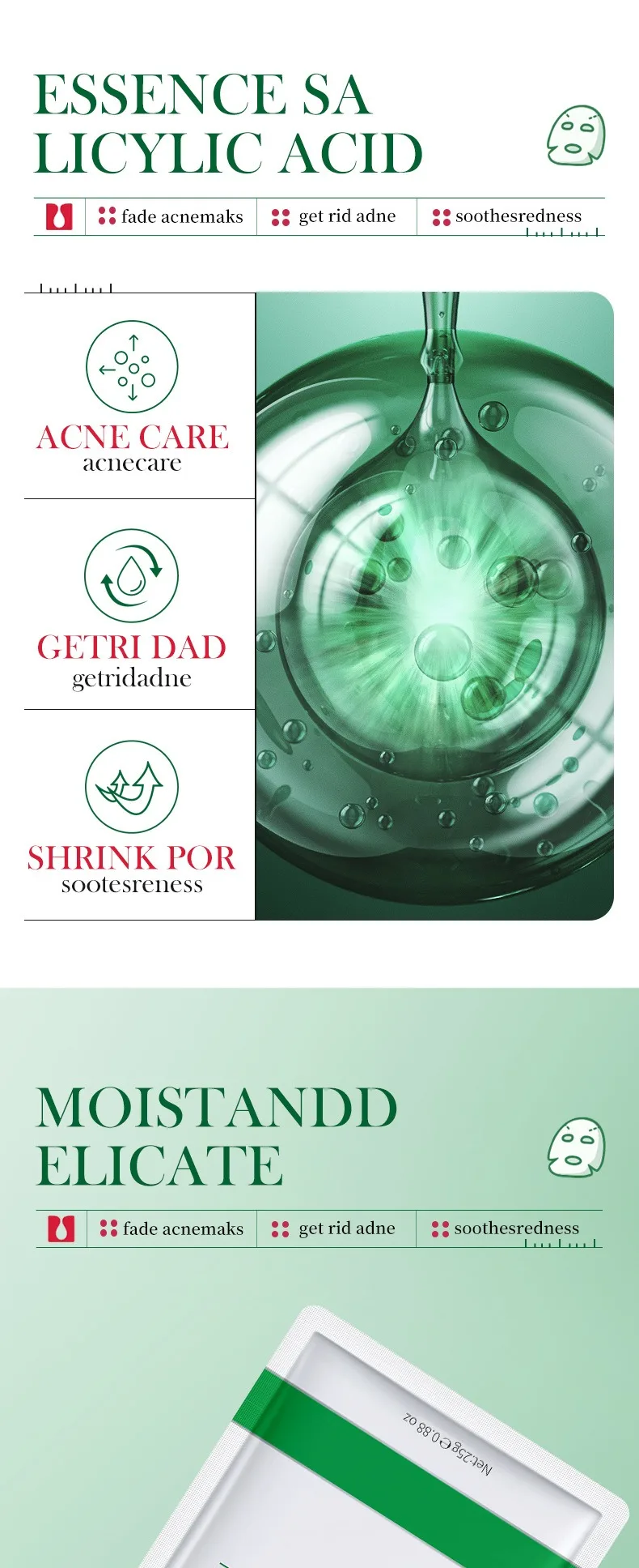 Soft light film cloth, breathable and free from acne, contains salicylic acid, penetrates the skin, comforts and repairs it,balances water and oil, controls oil and eliminates acne,leaving the skin with supple supple texture.