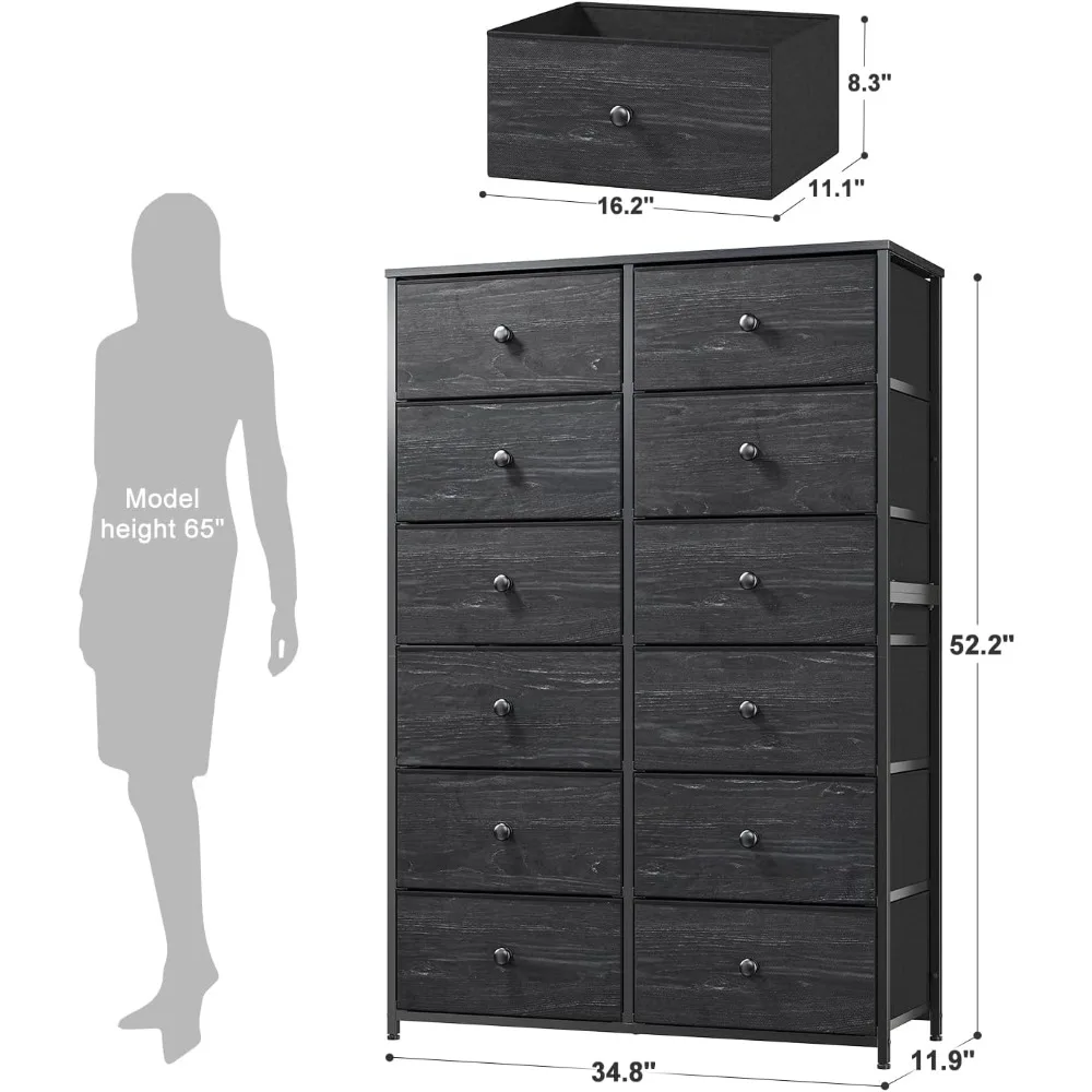 • Super large 6 tier drawer dresser with 12 drawers is an ideal choice when trying to keep the house organized. This dresser with 12 drawers sizes 11.9″D x 34.8″W x 52.2″H, let it be the best reinforcement to help manage all your stuff.