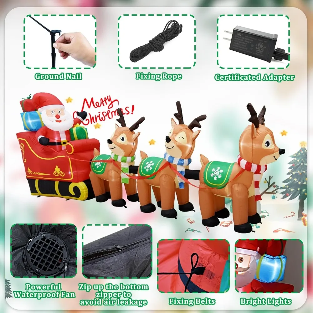 Inflatable Santa Claus on sleigh and 3 reindeer, with built-in LED lights for yard and garden Decorations