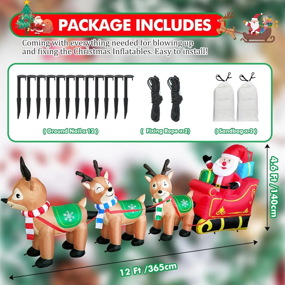 12 Ft Christmas Inflatables Outdoor Decorations Inflatable Santa Claus on Sleigh and 3 Reindeer,for Outdoor Home Holiday Decor