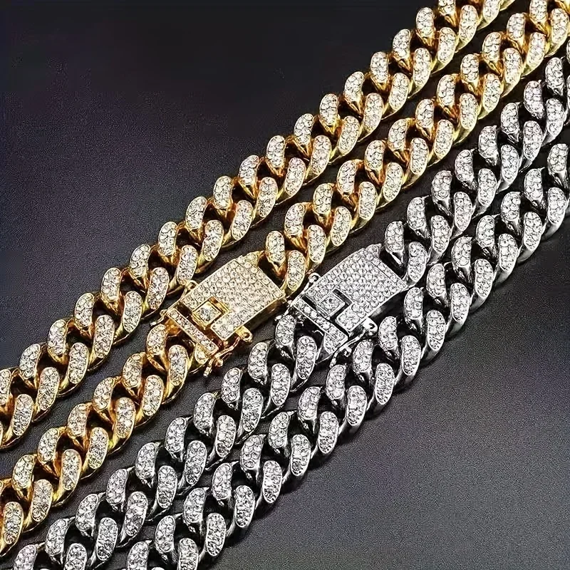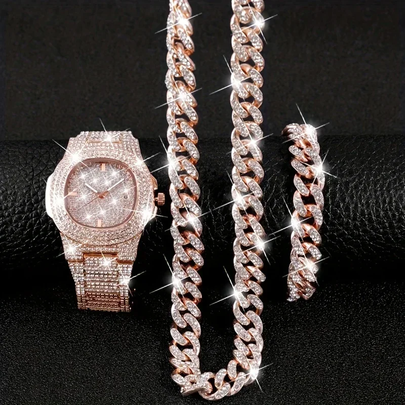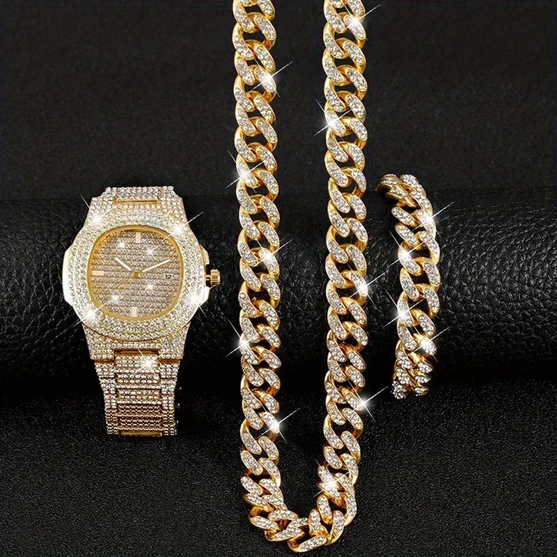 12mm Cuban Chain With Watch Set Gift Box Men’s Ice Inlaid Necklace Bracelet Watch Set Hip Hop Chain Ice Jewelry Men’s Jewelry