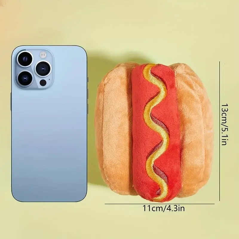 Other dogs also like it!It can effectively remove dental calculus, freshen breath, and clean teeth.Keep your dog's teeth healthy.The super soft plush dog will love the hot dog!The appropriate size (the length of the hot dog is approximately 5.12 inches/13 centimeters) makes it suitable for small and medium-sized dogs and puppies to play, hug, or chew.Your dog will love playing with these toys