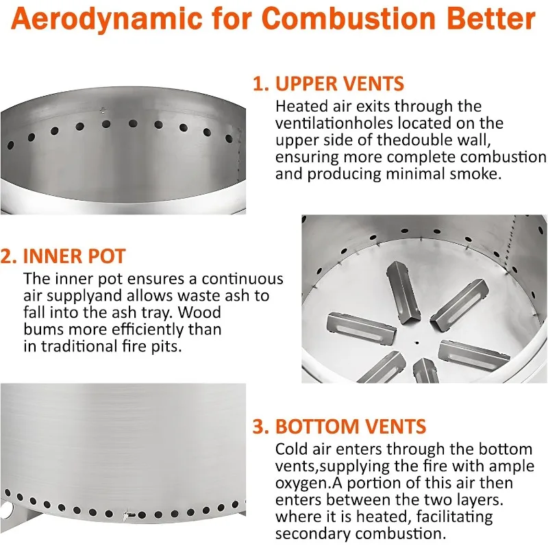 • 🔥Smokeless and Efficient Burning:Fire pit enhances the burning process by delivering more oxygen,which promotes the formation of secondary flames that effectively incinerate smoke particles before they reach your clothes and hair.Say goodbye to the hassle of smoky flames and enjoy your outdoor experience to the fullest