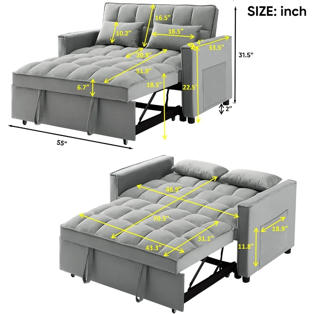 • Easy To Assemble: ofa Size: 53″L*34.6″D*31.4″H, Sleep Sofa Size: 70″ L*42″ W. Comes with an instruction manual, follow the instructions to assemble the parts, you just need to make up the 4 legs and the removable armrests on both sides