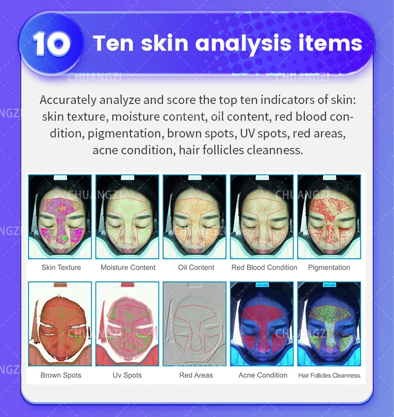 (1) 8 spectrum imaging (RGB white light, positive polarization, negative polarization, UV365, light, blue light 405, red light, brown light, comprehensive analysis of skin 14 skin indicators)