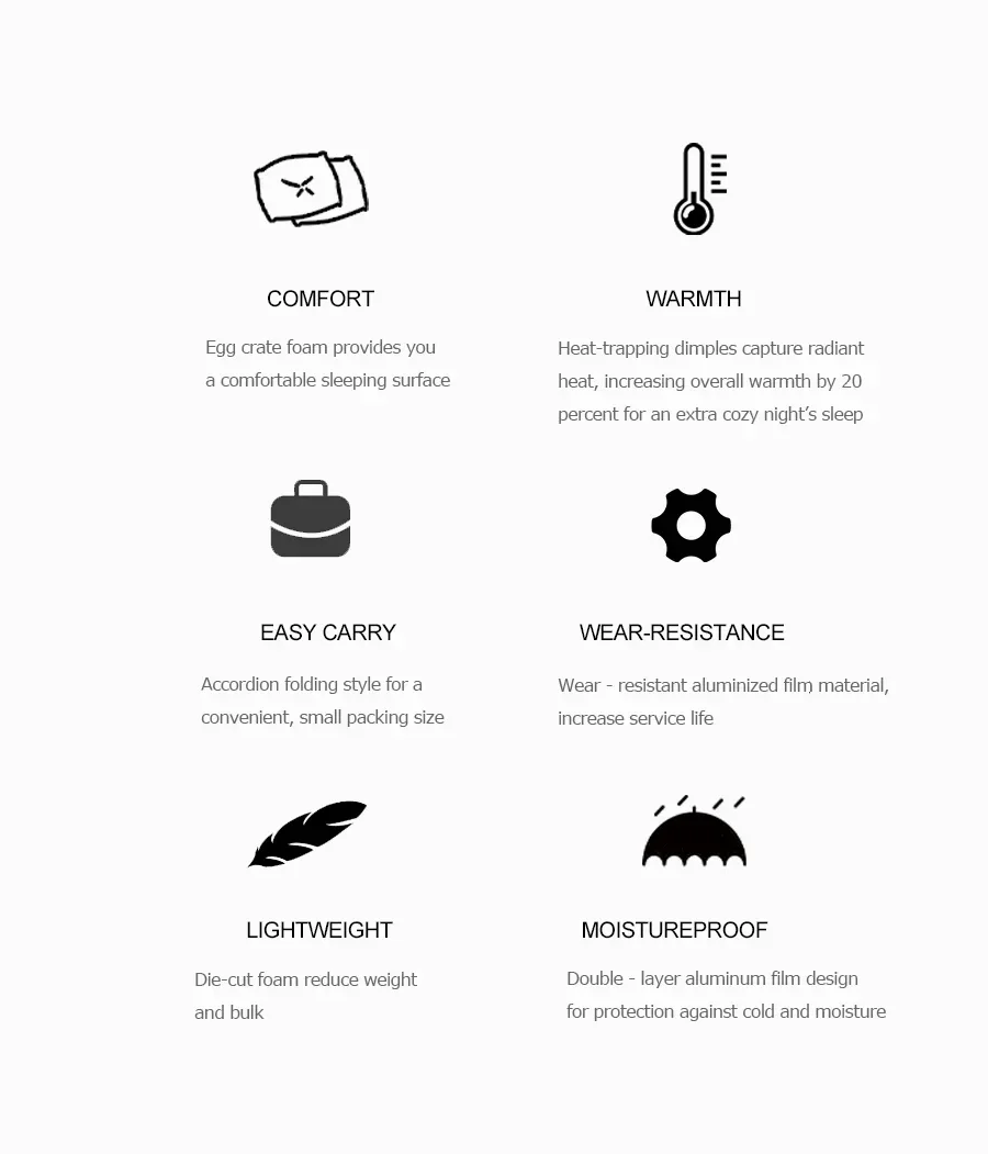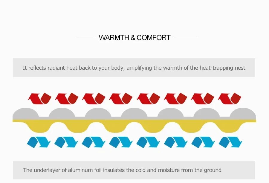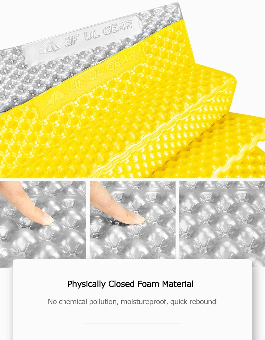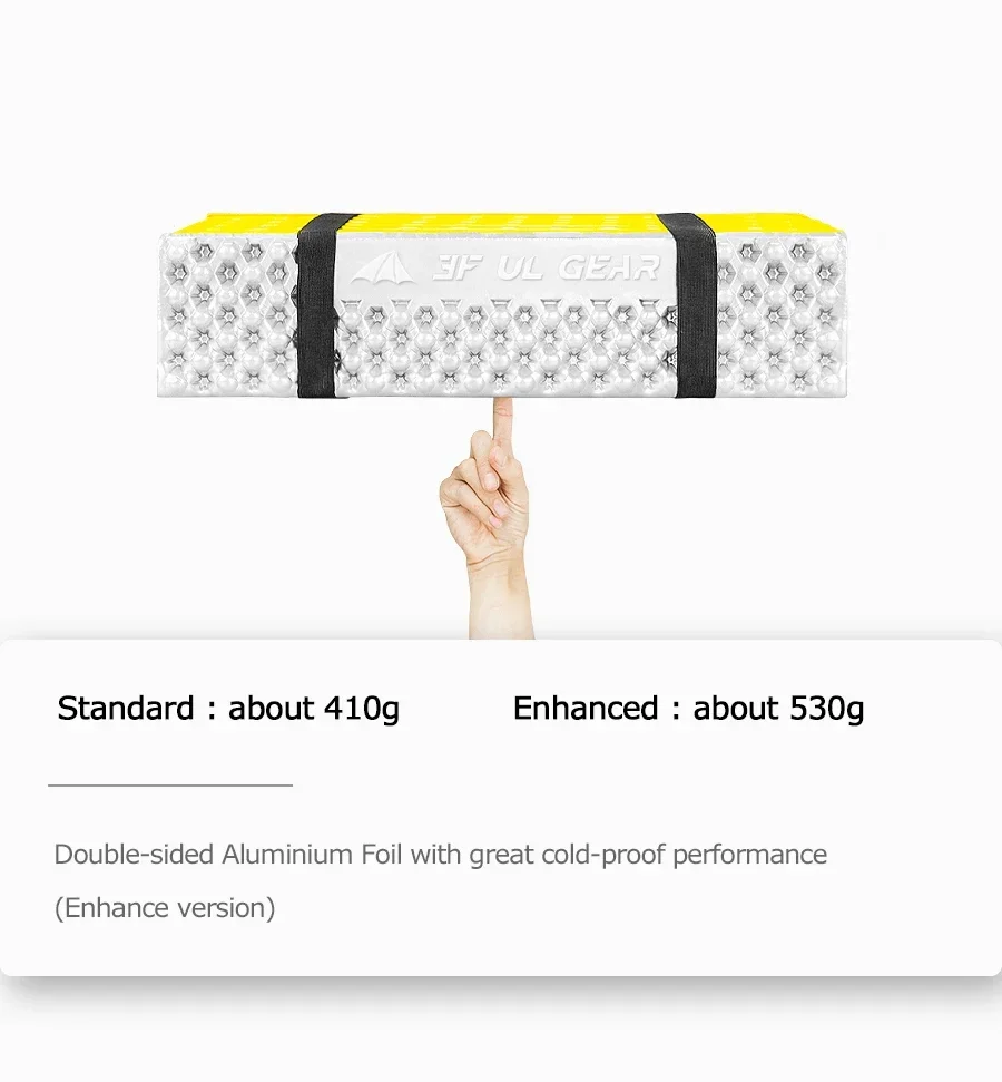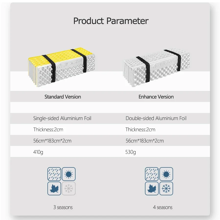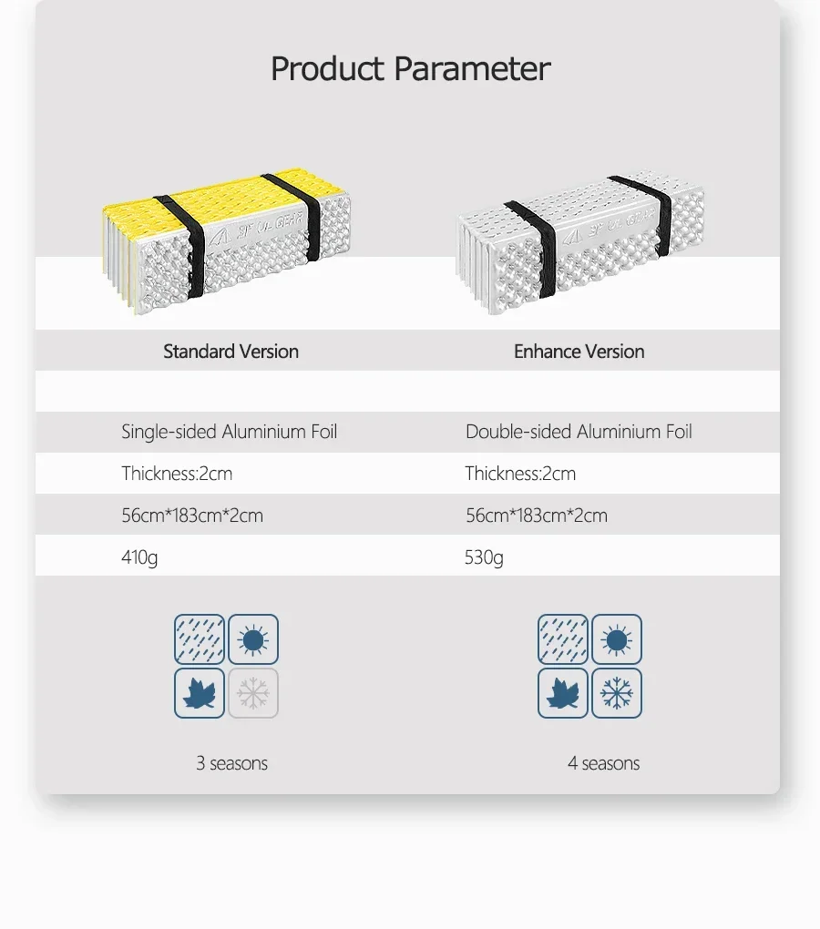 Weight:Standard Version:410g / 0.90lb / 14.46oz Enhanced Version:530g / 1.17lb / 18.70oz Flat Size:183cm x 56cm x 2cm / 72.05in x 22.05in x 0.79in Storaged size:56cm x 15cm x 13cm / 22.05in x 5.91in x 5.12in MATERIALS Color: Gray / Light Yellow Body: double-sided aluminum film/single-sided aluminum film LIST 1*Moisture-proof pad / 1*Storage bag NOTICE -As the fabric characteristics and measurement methods are different it may be purely in error with the actual object. -It is recommended to use a soft cloth dampened with water or detergent for cleaning.
