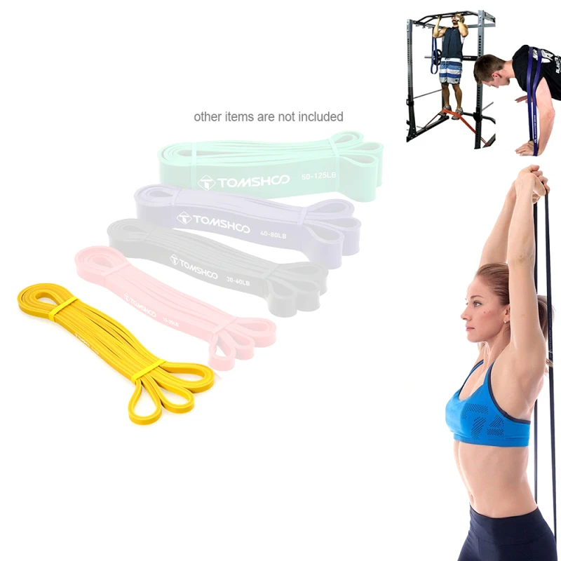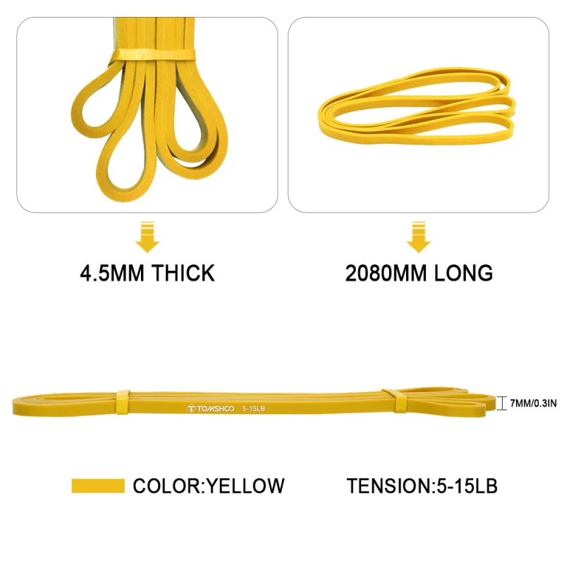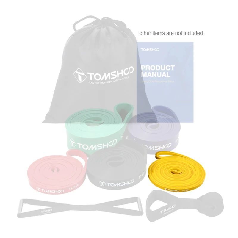 5pcs exercise bands with different colors, each is clearly marked with weight indication for different tension range: Yellow 5-15LB, Red 15-35LB, Black 30-60LB, Purple 40-80LB, Green 50-125LB. Use single band or combine more bands to perform challenging motion strength.