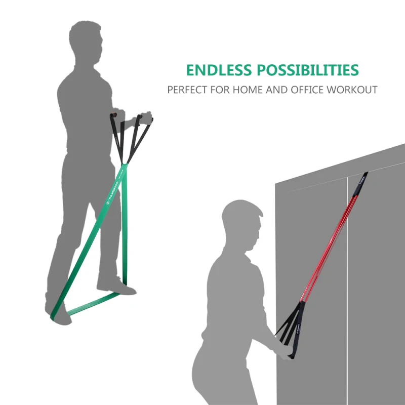 Resistance Range: Yellow 5-15LB, Red 15-35LB, Black 30-60LB, Purple 40-80LB, Green 50-125LB