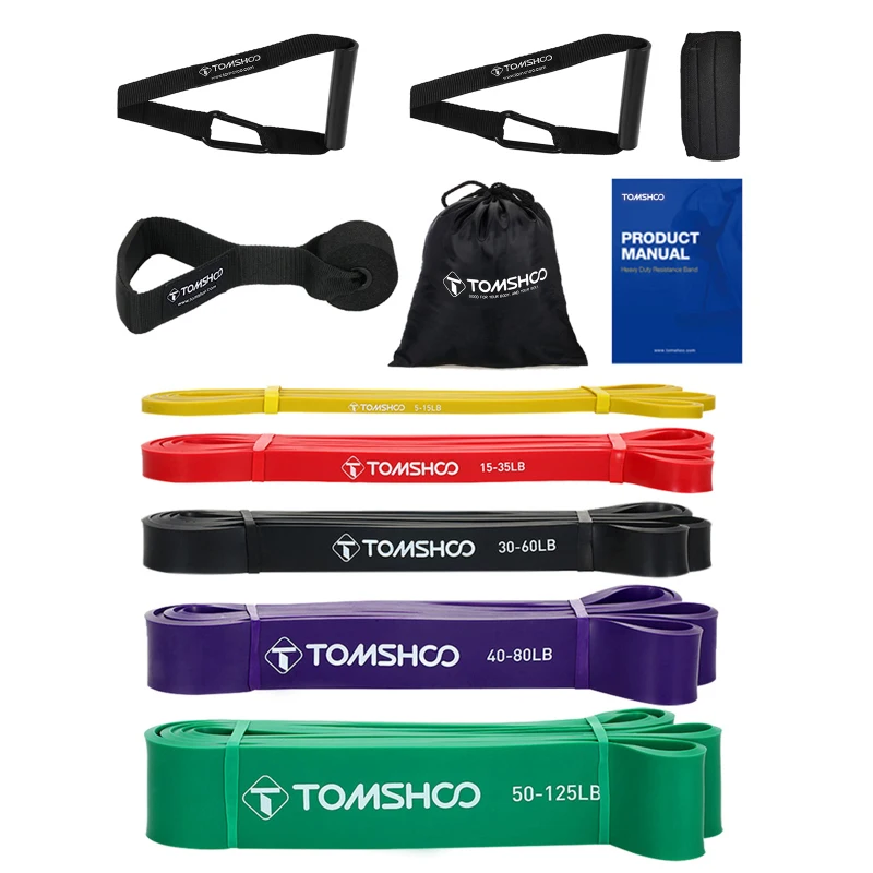 5pcs exercise bands with different colors, each is clearly marked with weight indication for different tension range: Yellow 5-15LB, Red 15-35LB, Black 30-60LB, Purple 40-80LB, Green 50-125LB. Use single band or combine more bands to perform challenging motion strength.