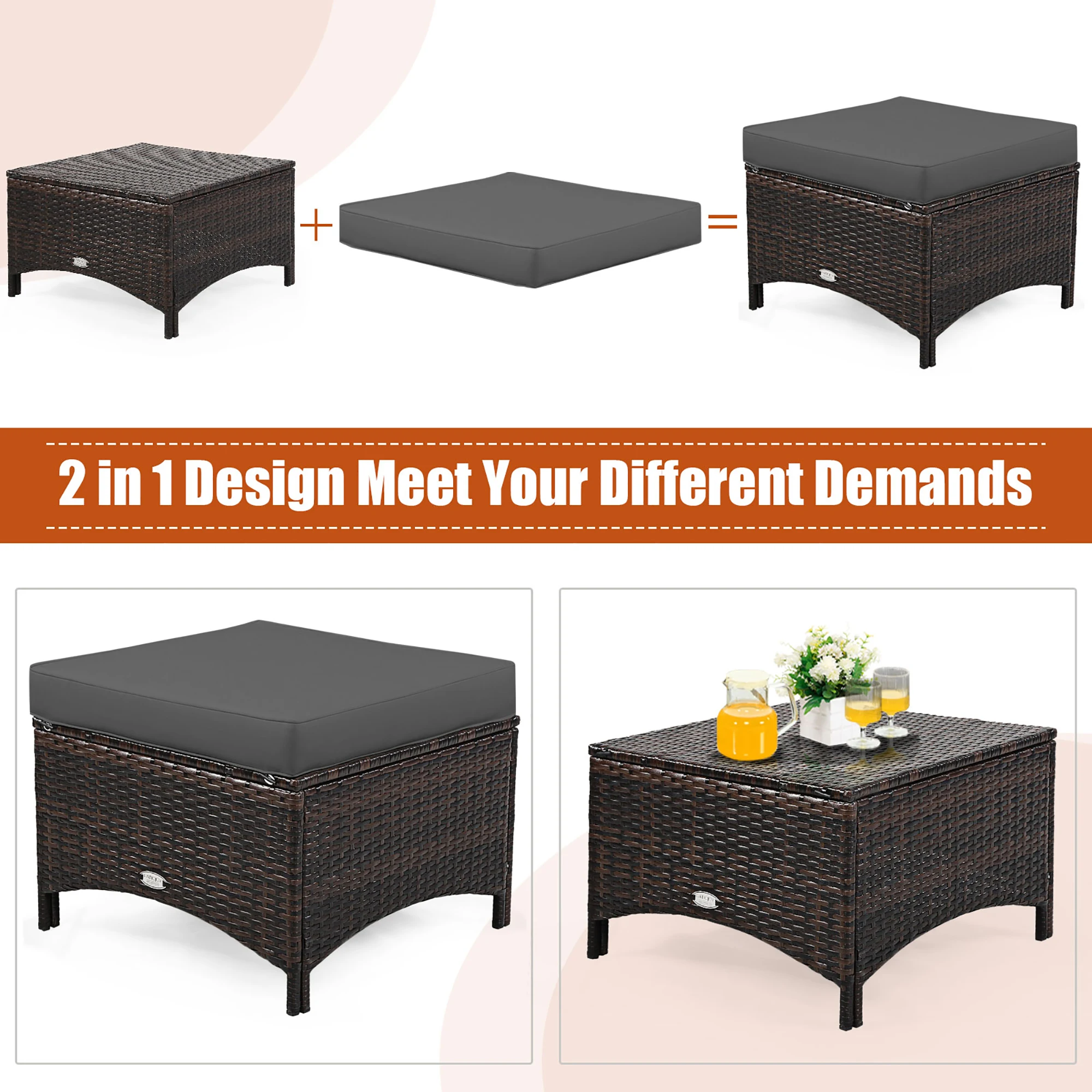 The ottoman can be used as a coffee table after removing the cushion