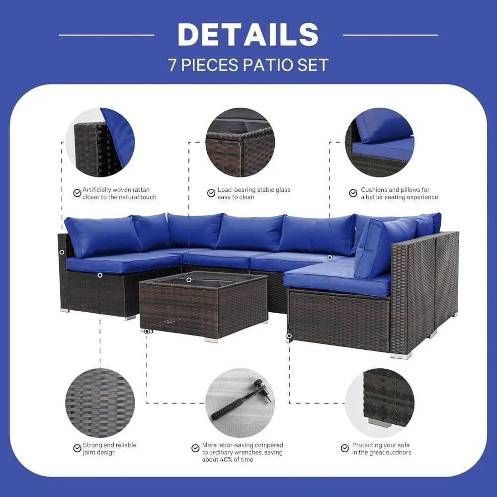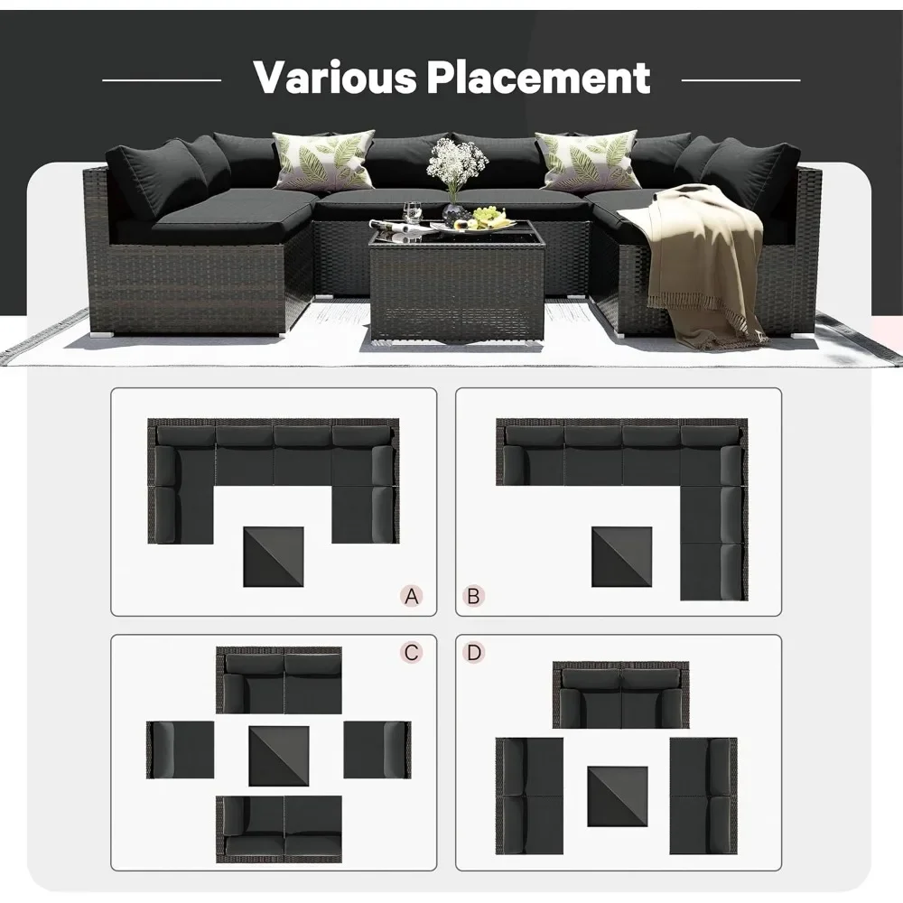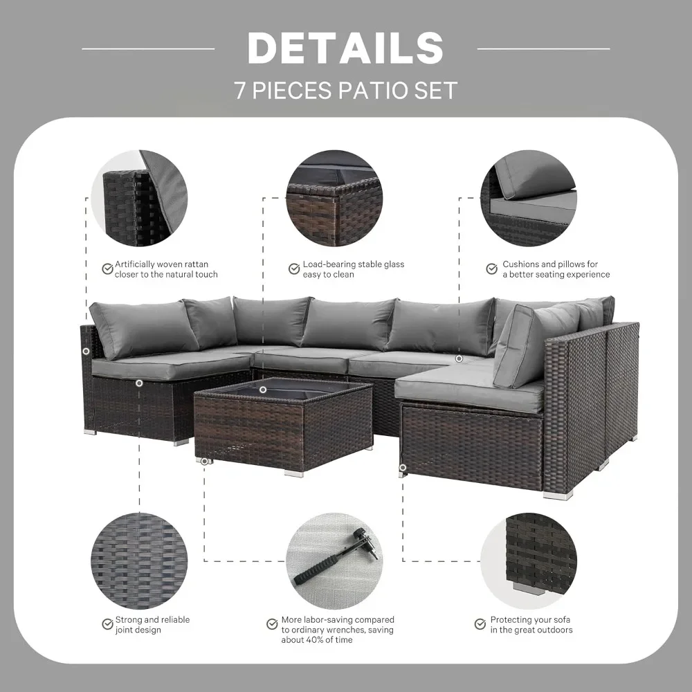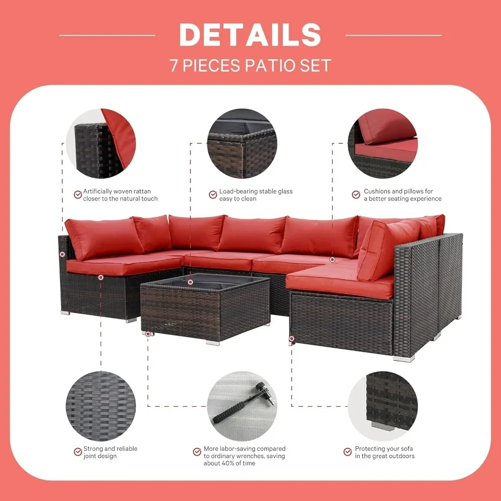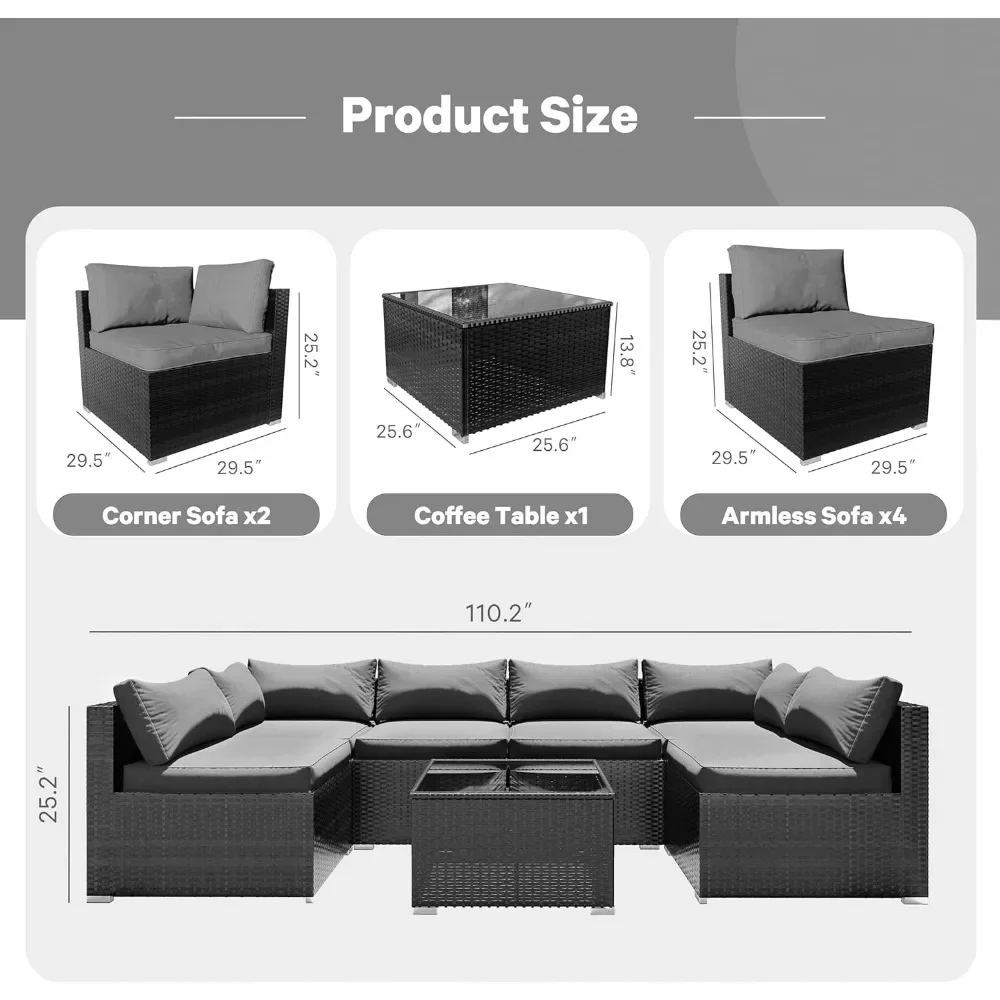 - OUTDOOR SOFA SET – The 7-piece outdoor sectional sofa features a sturdy steel frame that will never rust. Wicker is strong enough to withstand all weather changes. Thick waterproof durable cushions and tempered glass are easy to clean. Enjoy your great afternoon!