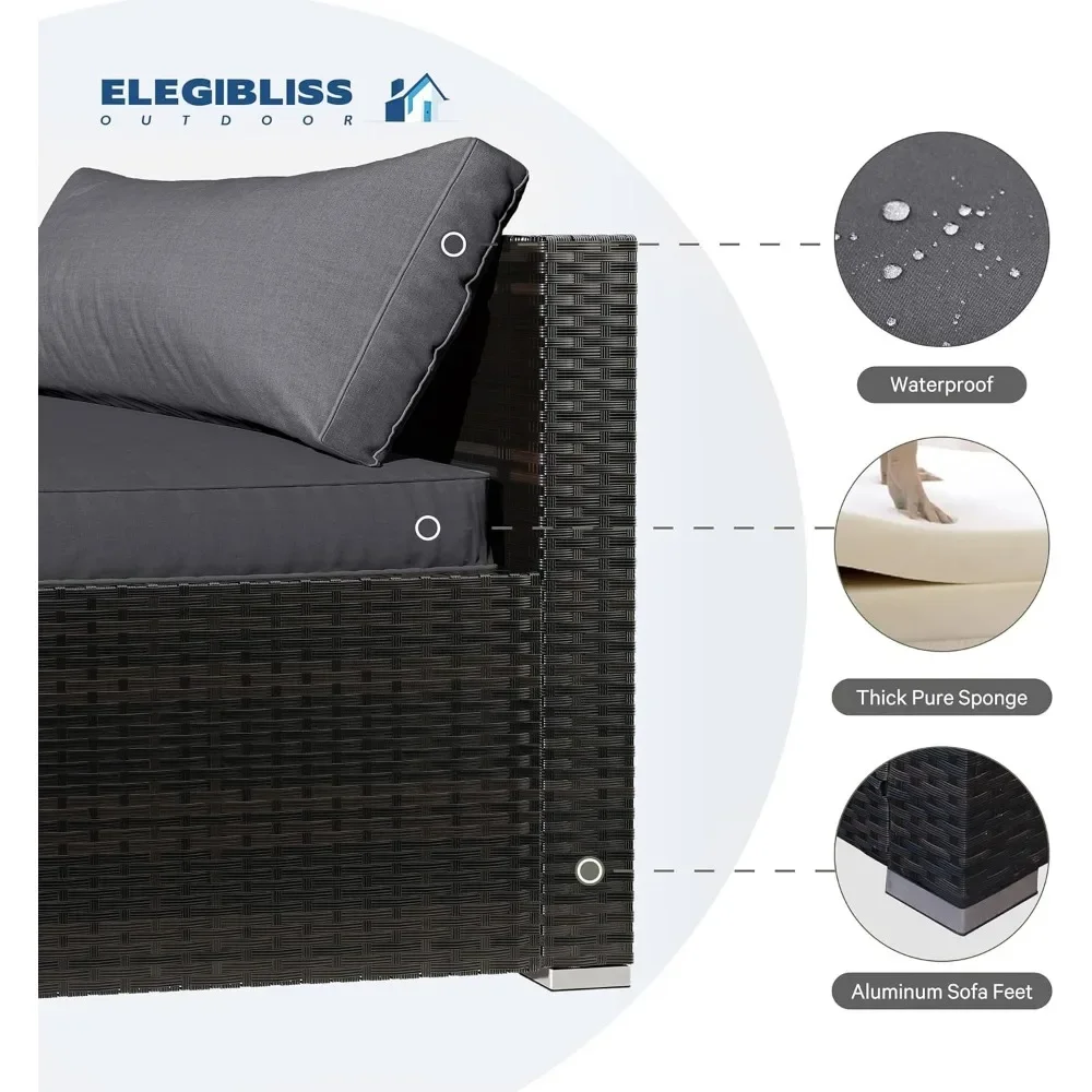 - WHAT’S INCLUDED – This outdoor patio sofa set comes with 3 boxes, including 4 single sofas, 2 corner sofas, 1 coffee table with a tempered glass top, cushions and seat fastener clips. We have different colors of rattan and cushions available.