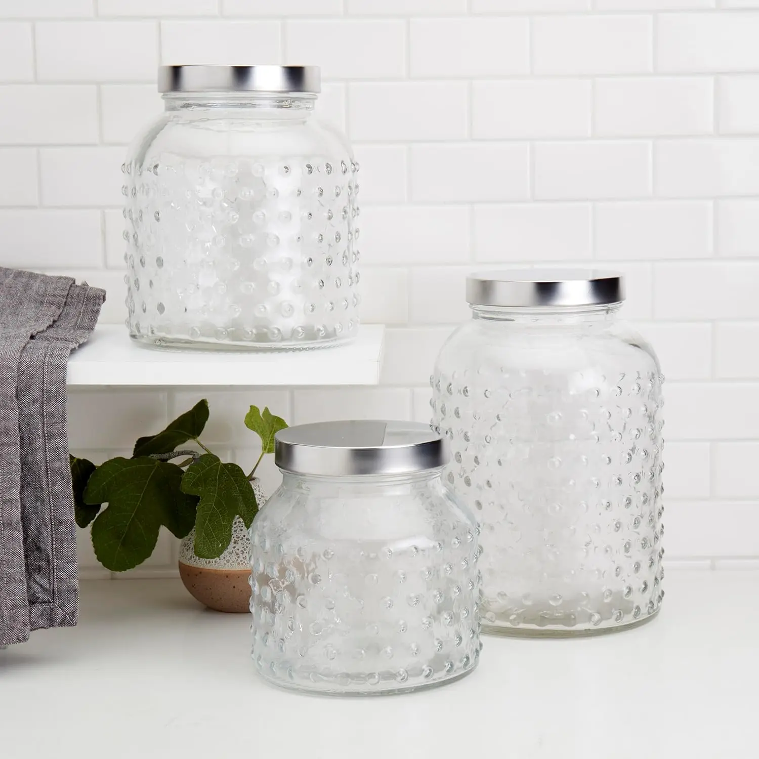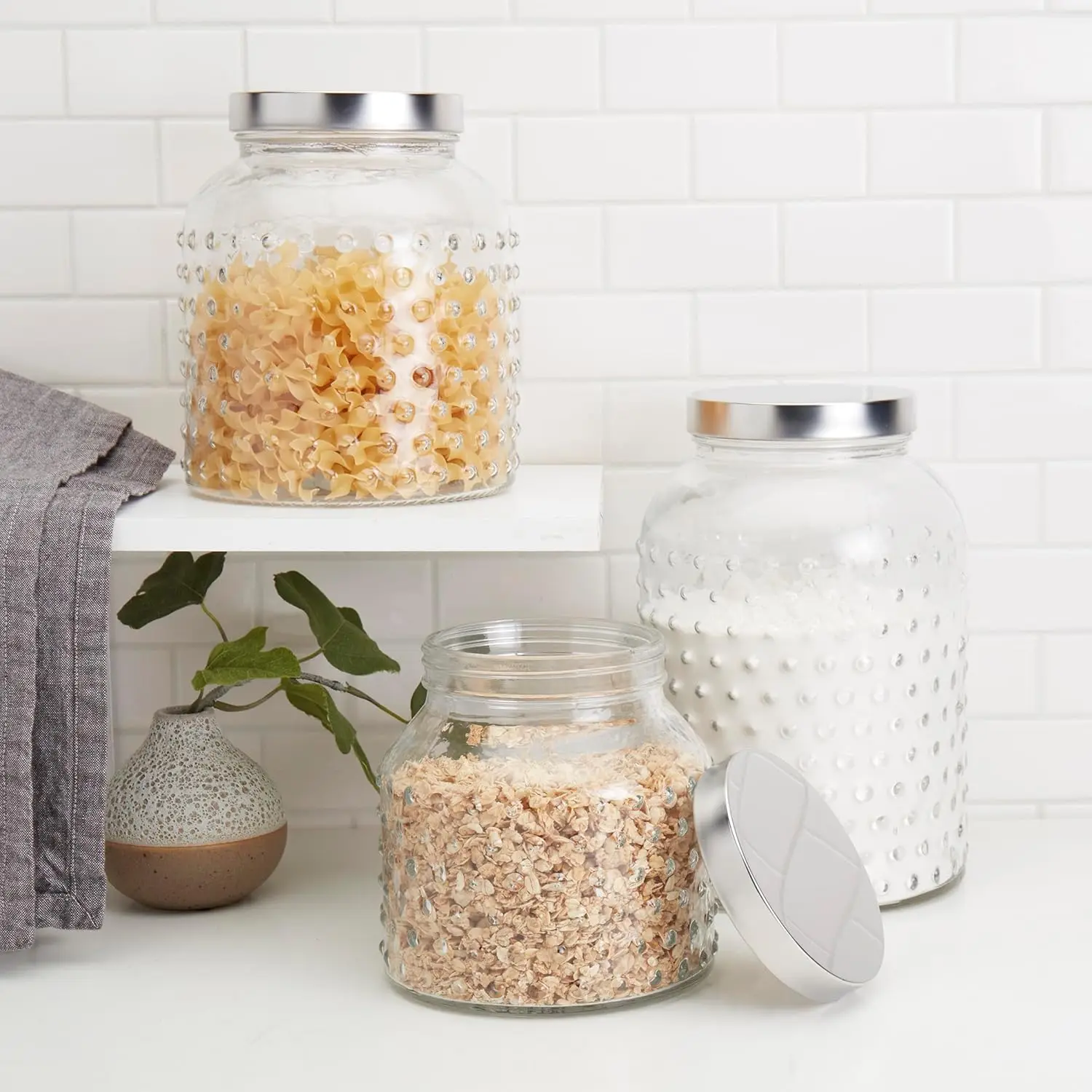 - ORGANIZE YOUR HOME: These glass canisters are great for a variety of storage uses; pantry storage, dry goods on the counter, or small items around the house. Durable and stain-resistant and a perfect storage solution for rice, sugar, spices, pasta, coffee…you name it! Also great in the bathroom for storing cotton balls, potpourri, and more! (Not intended for hot liquids)