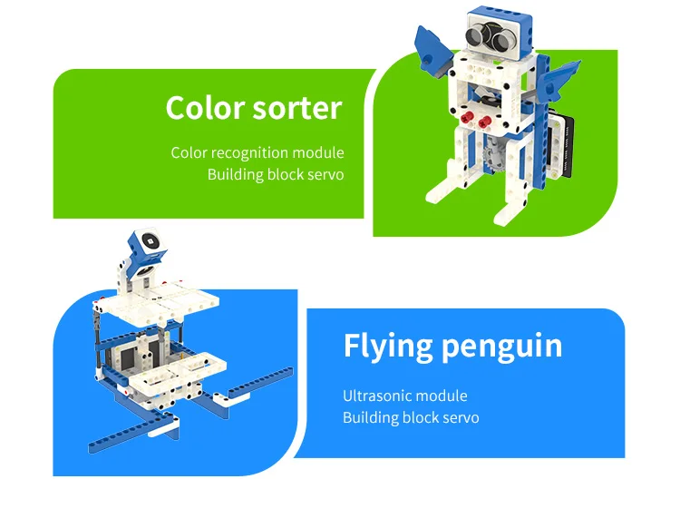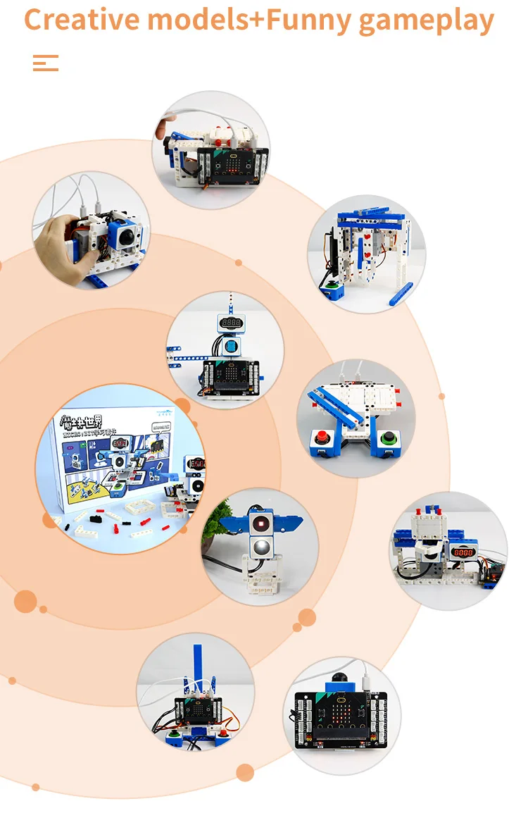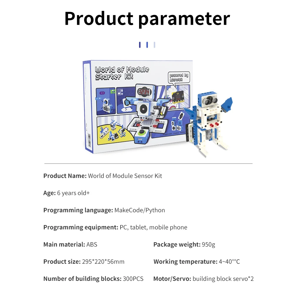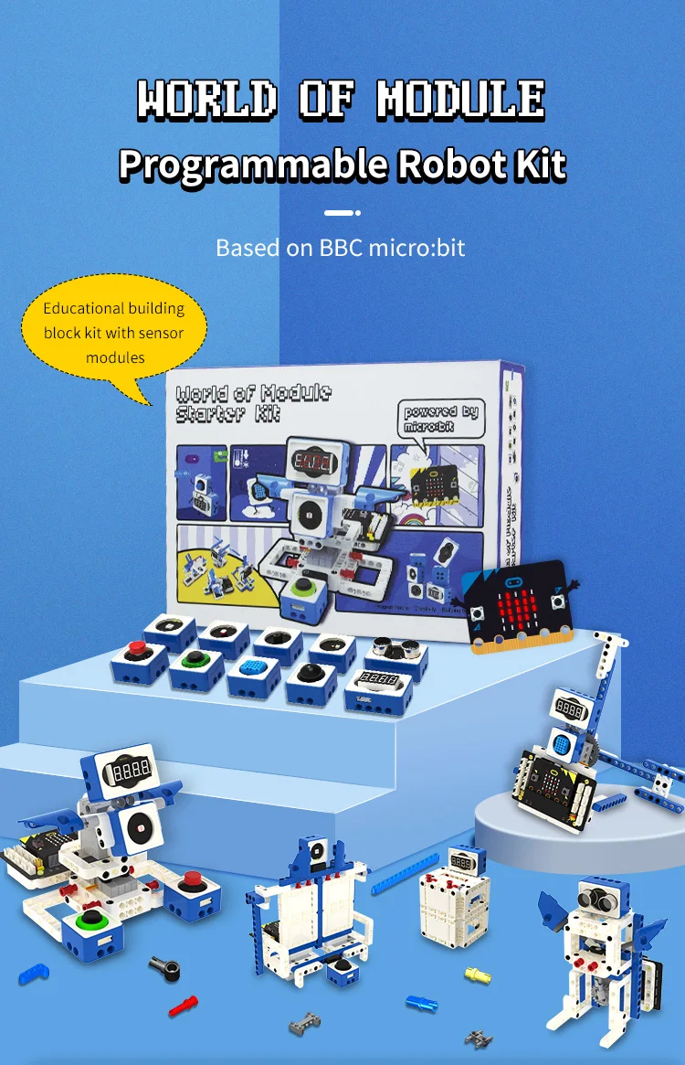 This world of module programmable robot kit includes 1 professional sensor expansion board, 2 building block servos, 10 electronic sensor modules and 300+ building block parts. Support MakeCode and Python programming, suitable for users over 6 years old. We have created more than 20 kinds of models, and also provided detailed experimental cases for children to learn programming and sensor knowledge while playing with building blocks.