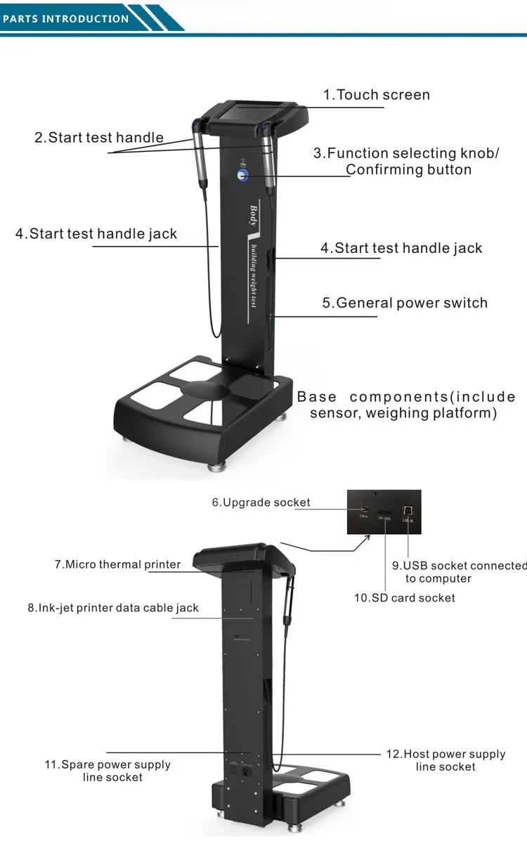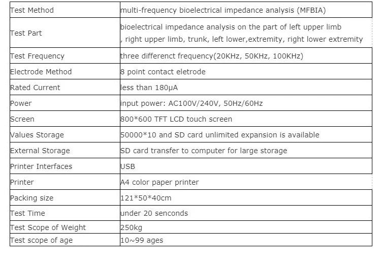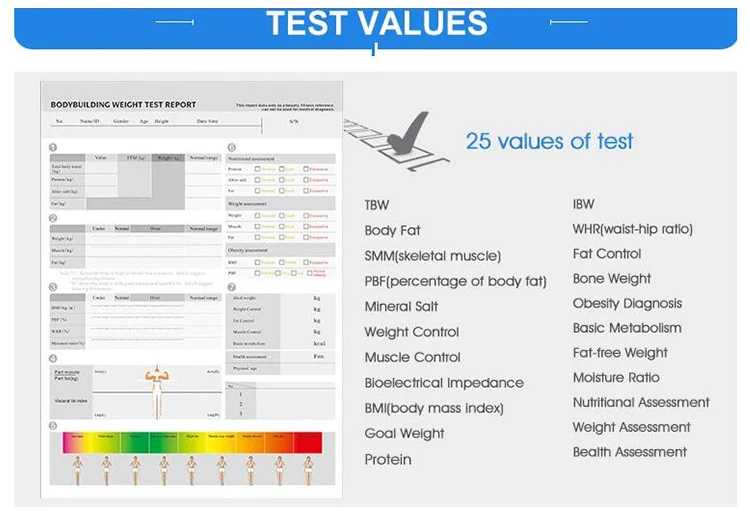 It can test more than 25 values, TBW, protein, mineral salt, body fat, bone weight, weight, IBW, fat-free weight, SMM(skeletal