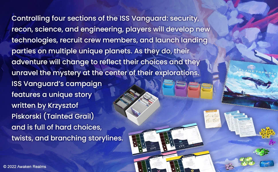 ISS Vanguard is a 1 to 4 player co-operative Board Game that can be played as a long campaign or in one-off missions. It brings players into an epic Sci-Fi adventure as they helm the first ship able to traverse deep space. Controlling four sections of the ISS Vanguard: security, recon, science, and engineering, player will develop new technologies, recruit crew members, and launch landing parties on multiple unique planets. As they do, their adventure will change to reflect their choices and they unravel the mystery at the center of their explorations. ISS Vanguard’s campaign features a unique story written by Krzysztof Piskorski (Tainted Grail) and is full of hard choices, twists, and branching storylines.