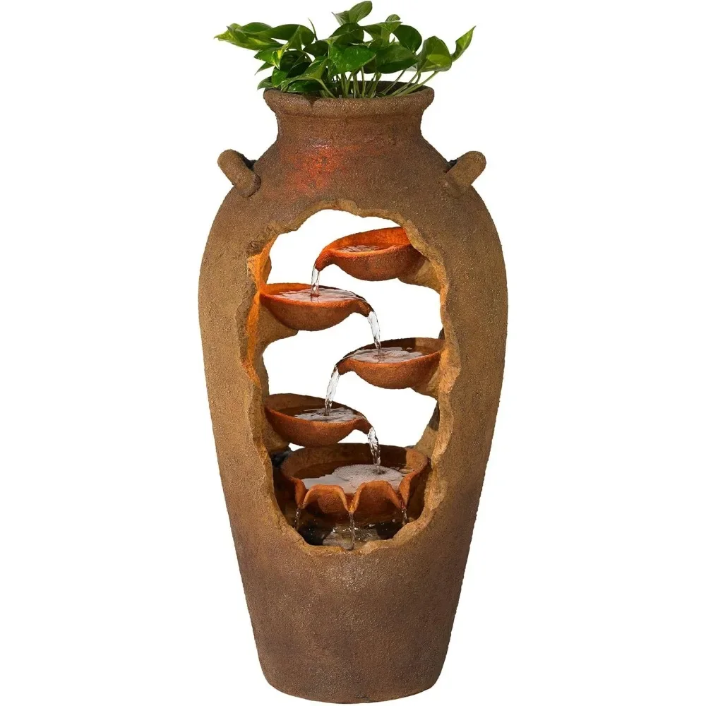 - LED cluster illuminates the inside of the fountain design at night. Built-in planter space at the top for a real or faux plantings.