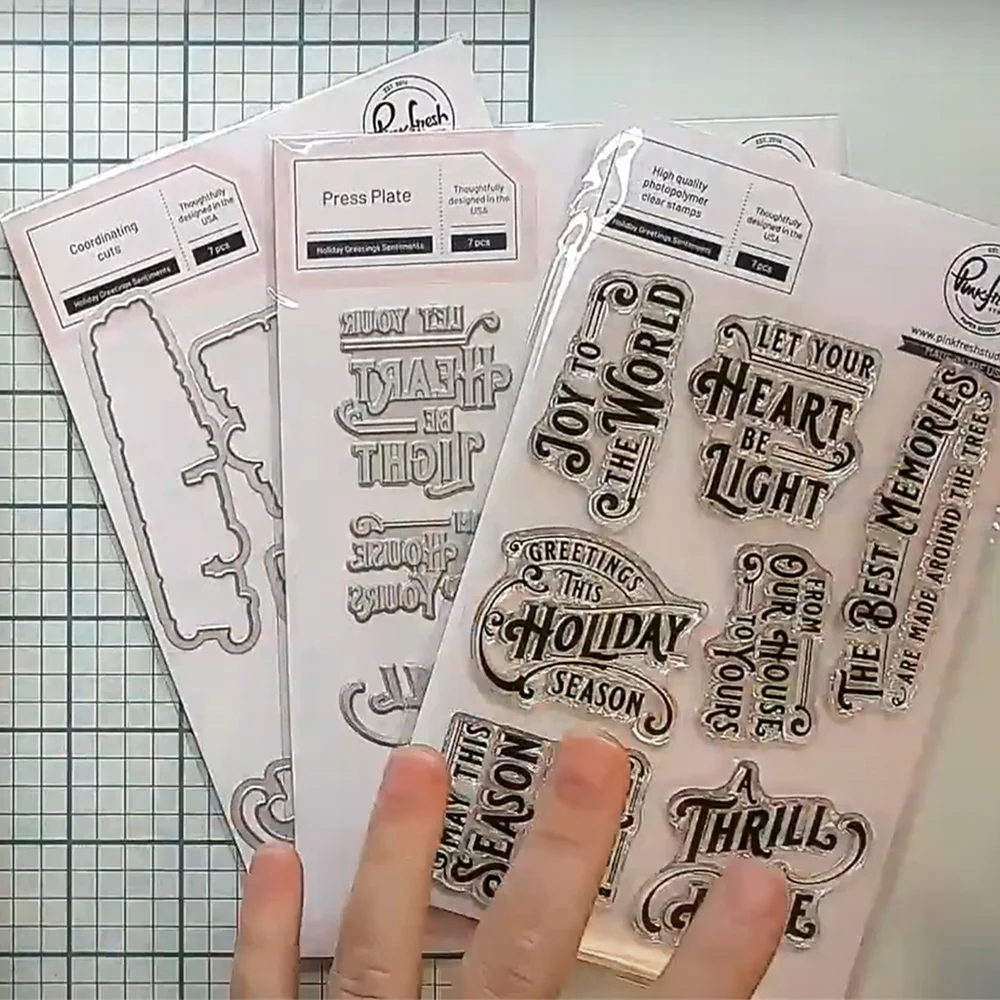 Z9167- DIES: approximate size: Joy to the world 1" x 2", Let your heart be light 1.7" x 1.5", The best memories are made around the tree . 8" x 3", From Our House to Yours 1" x 1.6", Greetings this Holiday Season 1.5" x 1.8", May this Holiday Season Bring You Peace 1.4" x 1.7", The Thrill of Hope 1.6" x 2"