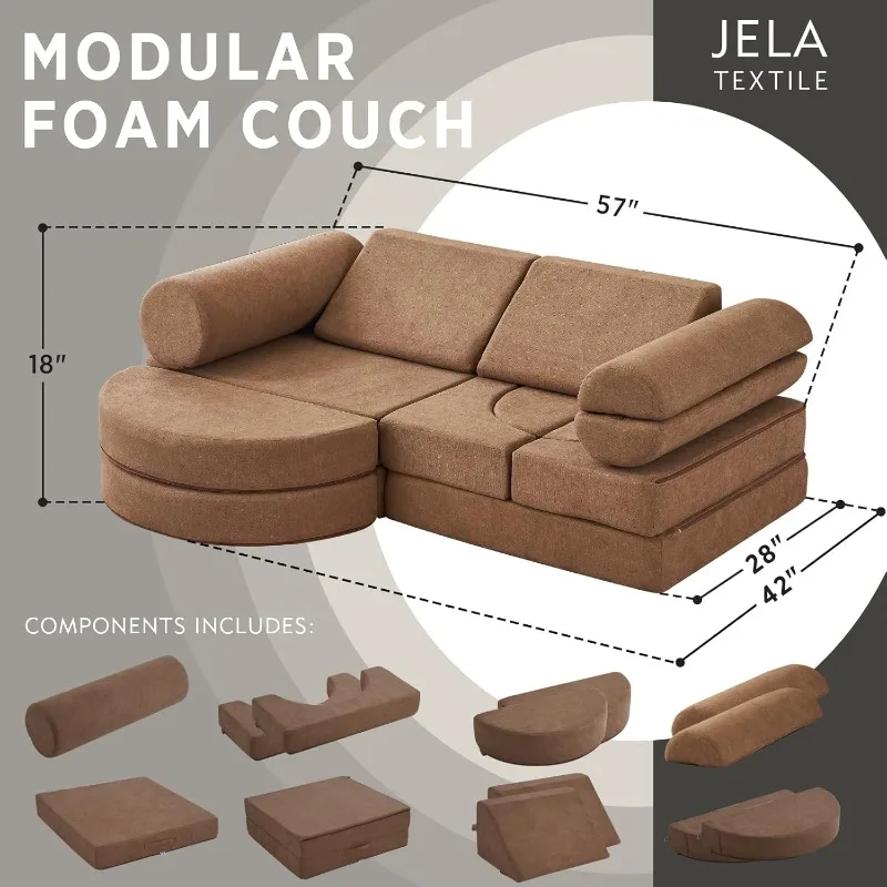 • New trendy Foam furniture – The kids couch set includes 4 basic cushions(1 basic cushion can be detached to 4 parts to meet your forts building need ), 3 armrest parts, 2 triangle pillows, 2 semicircular cushions for your free combination like couch, playhouse, reading corner, castle, play tank, happy hammock. The Whole dimension is 57x 28x 18 inches when it is built.