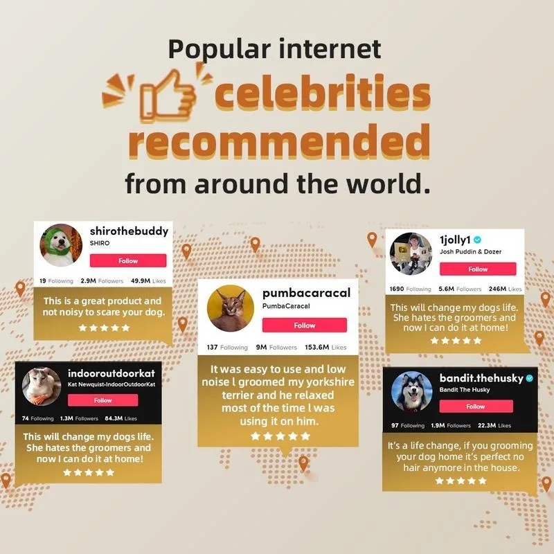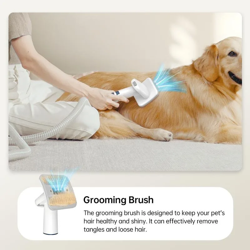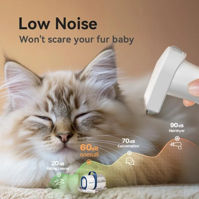 【Low Noise Design】 Our pet grooming vacuum’snoise only 60 dB.3 adjustable suction levels to choose,making your pet dogs feel relaxed and not be scaredduring grooming.We suggest grooming your pet with ourbrush before trimming pet hair, avoid making your petnervous because of vacuuming noise, which conclusivelymakes the grooming experience even more enjoyable.