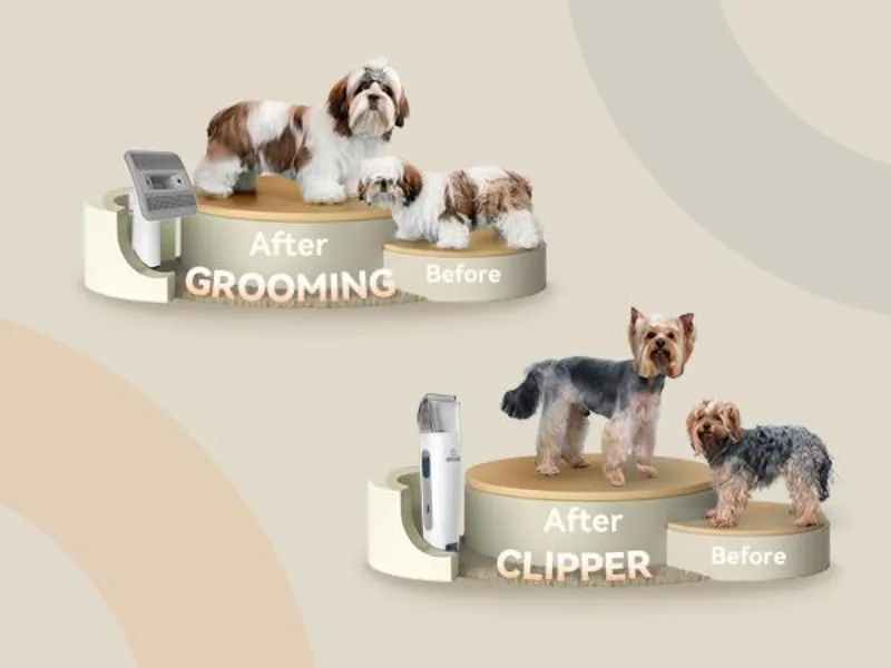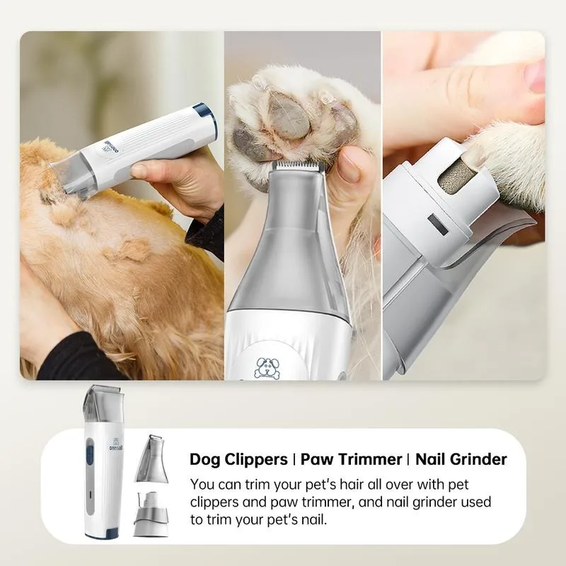 【7 in 1 Pro Pet Grooming Kit, Keep the HouseTidy】oneisall pet grooming kit with vacuum make homegrooming easy.The grooming brush and the desheddingtool gently remove loose hair and making pet hair shinyand smooth while eliminating tangles. Electric clipper,dog paw trimmer and dog nail grinder provides excellentcutting. Give your pet a best grooming experience.Nozzle head and Cleaning brush can be used forcollecting pet hair falling on the carpet, sofa and floor.