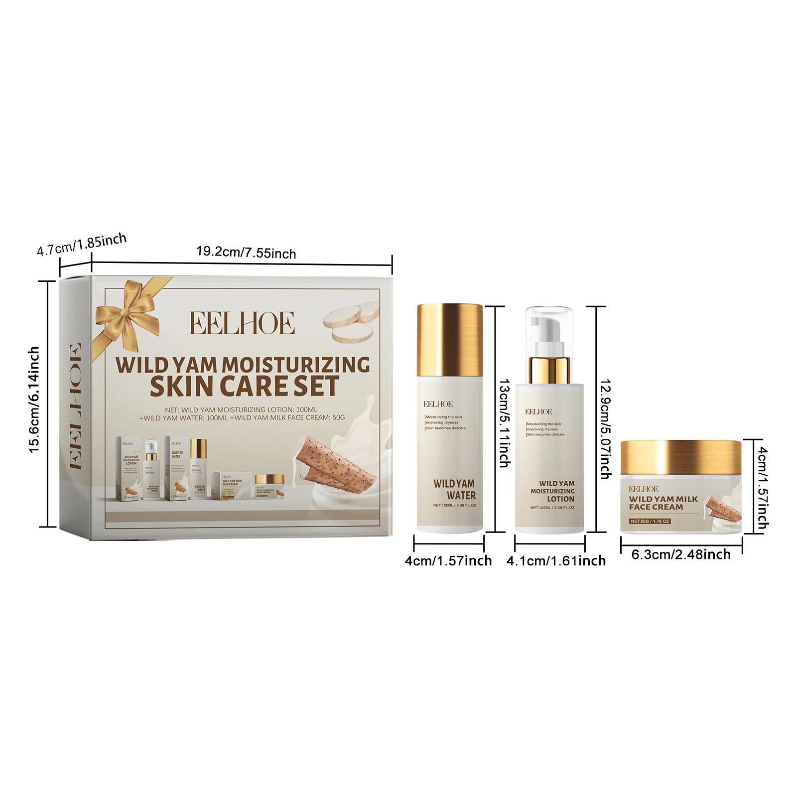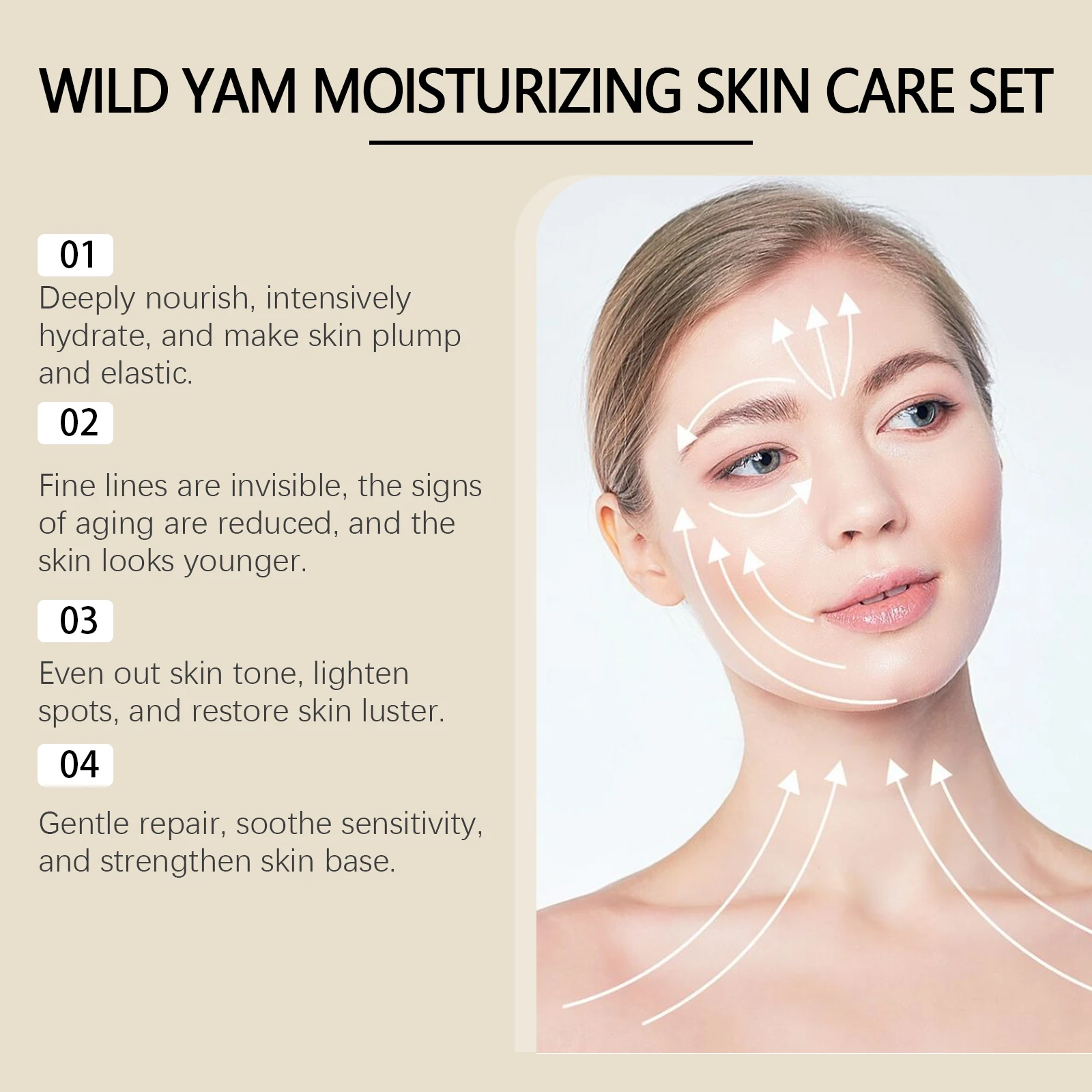 Our Wild Yam Moisturizing Skin Care Set contains Oat Extract, Milk. It forms a protective film against external aggressions. It is easy to use: clean and dry facial skin, take an appropriate amount of cream, lotion and toner and apply evenly on the face in order. Massage gently until absorbed. And it can penetrate deep to provide long-lasting moisturization.