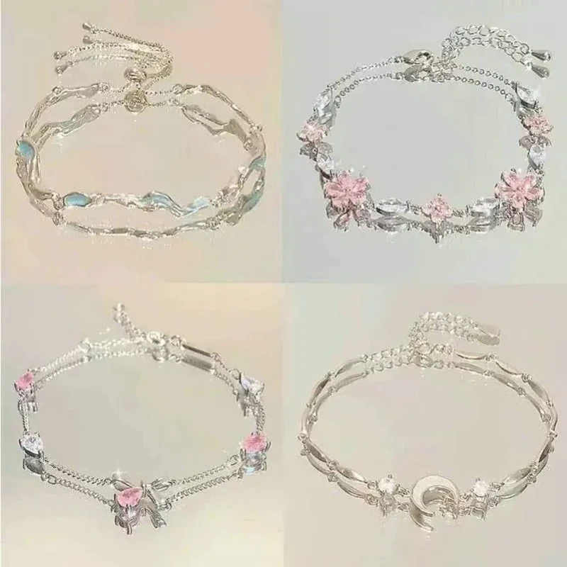 Home Store Fashion & Accessories Jewelry Elegant Fairy Pink Crystal Zircon Sakura Flowers Bracelet for Women Y2K Sweet Girls Cherry Blossom Moon Bow Knot Jewelry Gifts