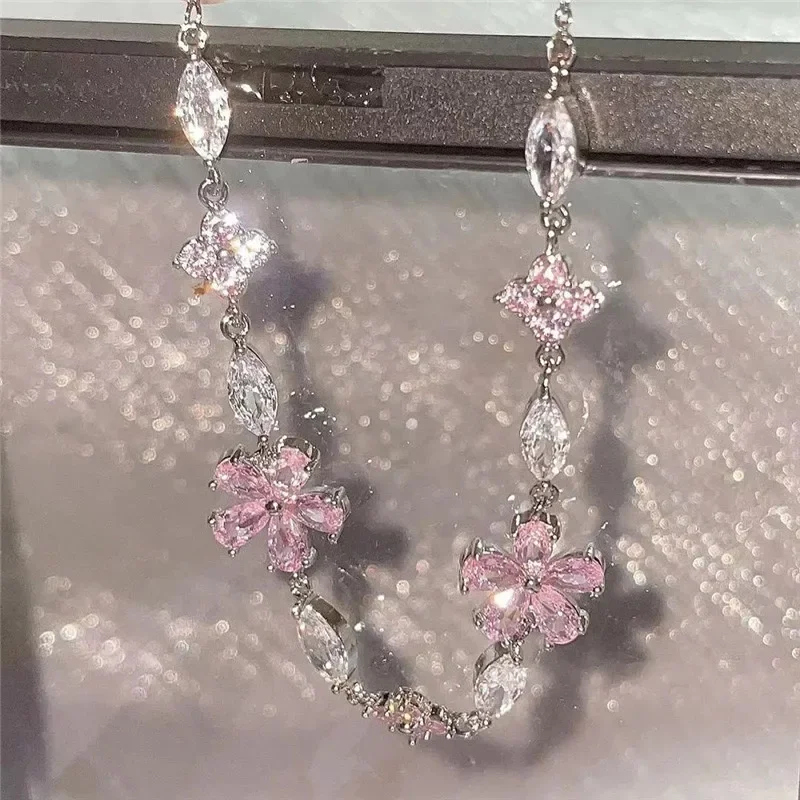 Elegant Fairy Pink Crystal Zircon Sakura Flowers Bracelet for Women Y2K Sweet Girls Cherry Blossom Moon Bow Knot Jewelry Gifts