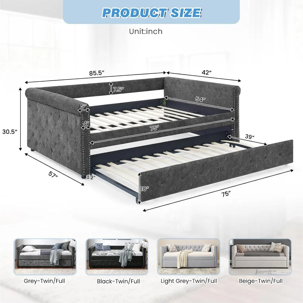 Home Store Home Decor Furniture Fabric Upholstered Full Size Day Bed Button-Tufted Sofa Frame w/Twin Roll-Out No Box Spring Needed, Furniture