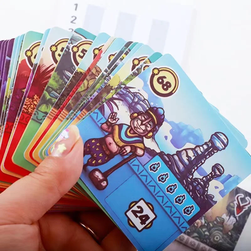 If a player plays a card with a higher value in the top left corner than the card he played in the previous round, he draws 1+ the temple card of the number of clue ICONS he has.