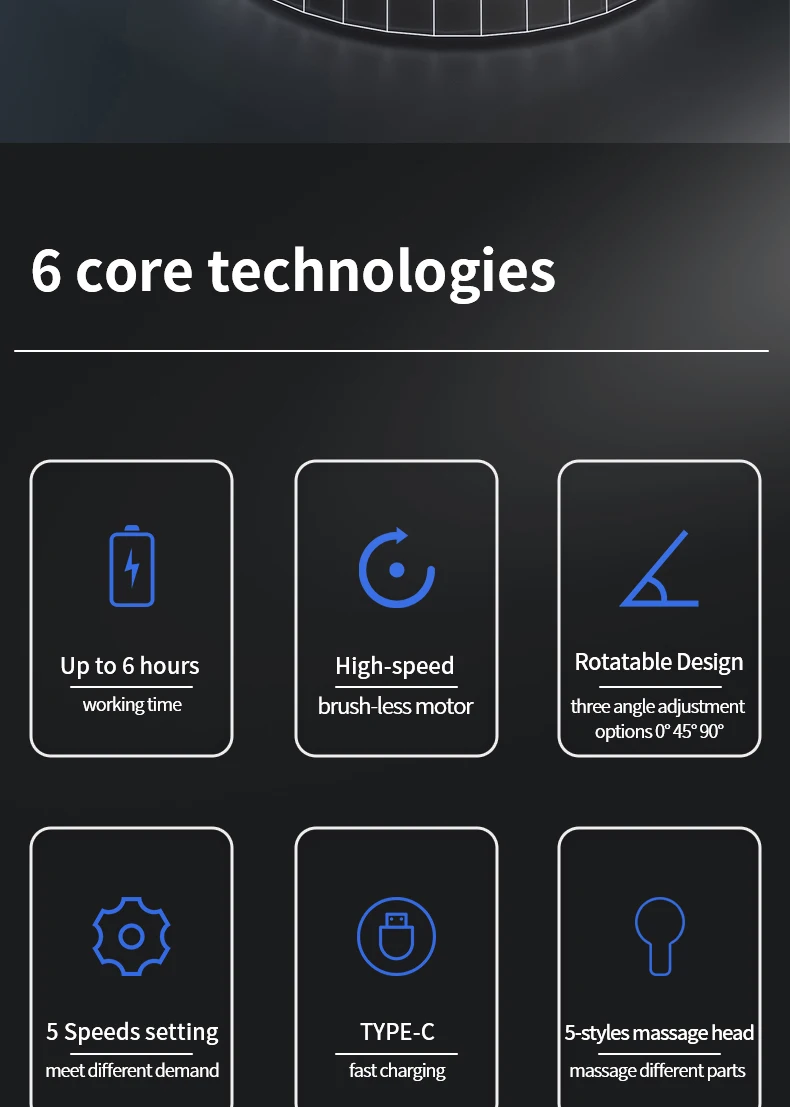 Hign-concerned Chemical: None Certification: none Material: ABS & TPR Item Type: Massage & Relaxation Origin: Mainland China Feature1: Deep massage Feature2: Multiple massage head Feature3: Multispeed control Feature4: Silent