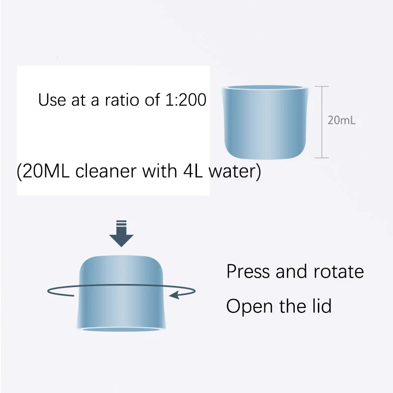 First step:Please follow the dilution ratio of 1:200, (1 bottle cap is about 20mL, suitable for about 4L of water) after shaking evenly, you can use it.