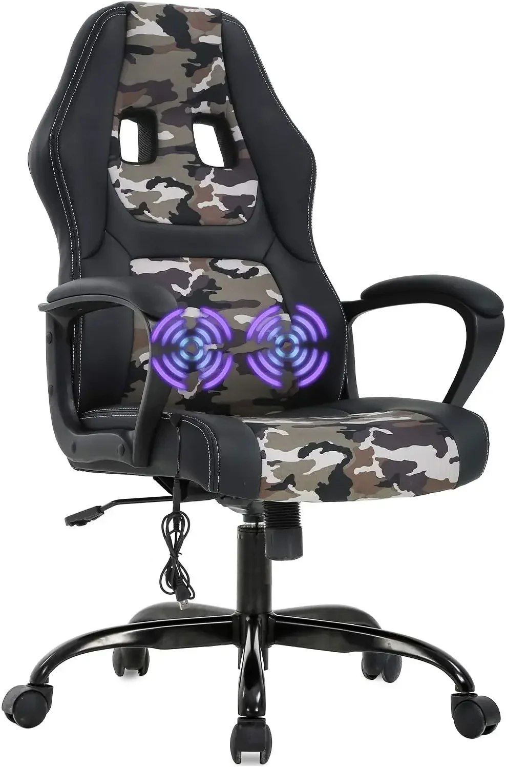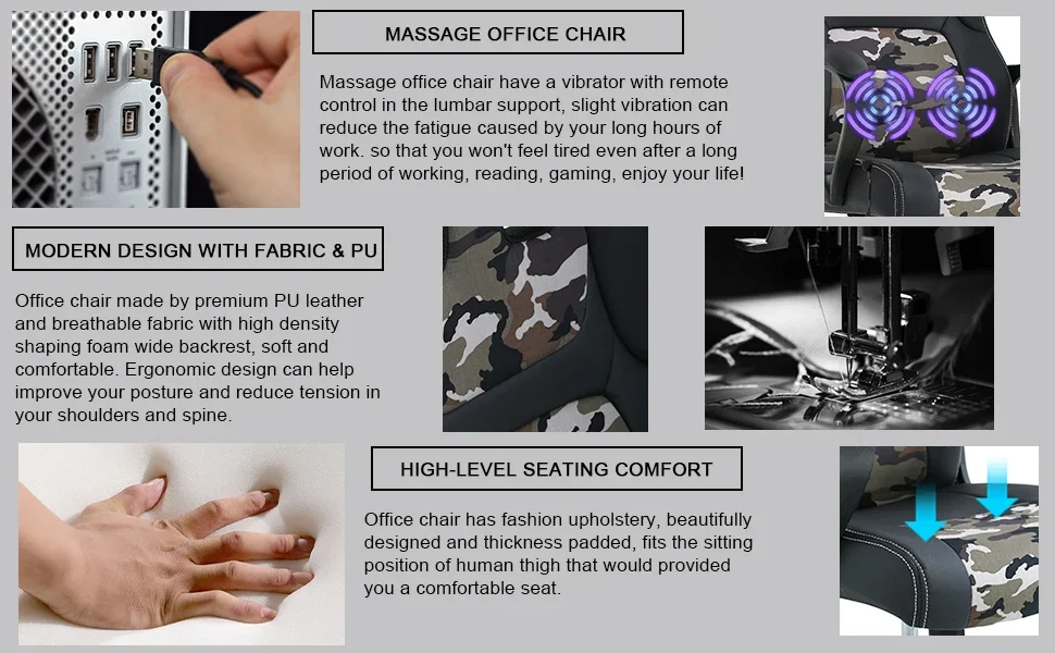 We present this brand new racing type high back office chair with a unique appearance and feel, unlike most office chairs on the market, it have a vibrator with remote control, slight vibration can reduce the fatigue. And If you don’t want to use the massage function, you can roll up the data cable and put it in a small bag. This race chair has a higher backrest to support the entirety of your spinal column. And Our desk chairs offer a stable five-point base with a gas spring, allowing the use to adjust for varying heights to better meet the needs of your office or computer desk. Seat height: 17.3″-21″; Seat wide: W20.9″*D19.3″.