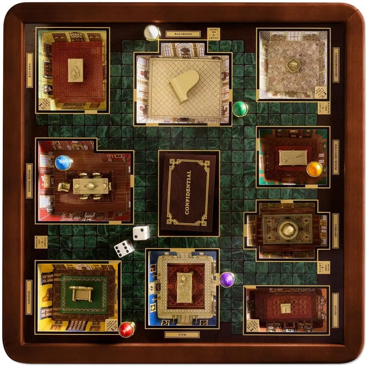 This Luxury Edition of Clue attempts to set the high water mark for quality and luxury for the most famous murder mystery game of all time. This luxury starts with a handsome burl-finished furniture-quality wooden cabinet. Decorative die cast metal Clue name plaques adorn two sides. Unlike the traditional fold-flat cardboard version of the game, this luxury edition features 3-Dimensional mansion rooms. This is accomplished by placing the rooms inside the game cabinet, underneath the playfield, which is topped with tempered glass, giving the game board depth.