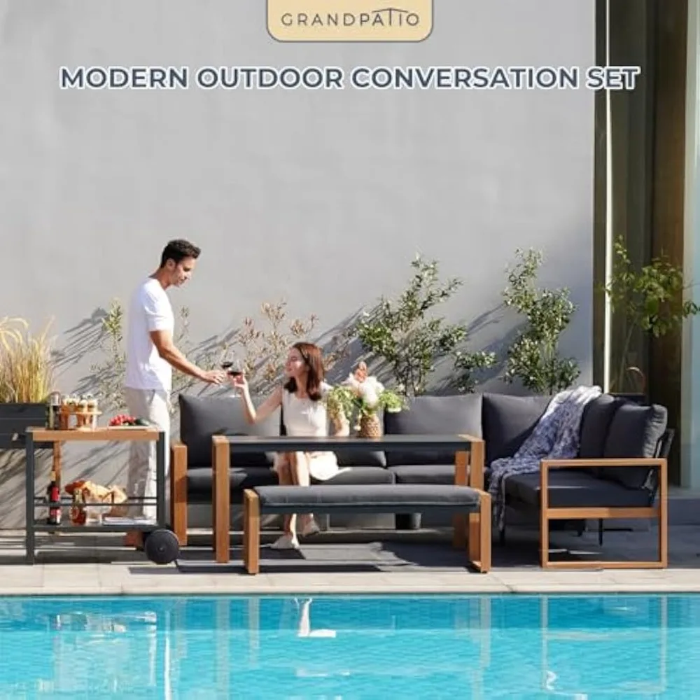 - Modern Style: This patio conversation furniture set is an excellent fit for outdoor and indoor areas, featuring a minimalist design that adds a touch of modernity. Its simple, modern lines bring a minimalist “California-cool” infused style, making it perfect for your outdoor patio, deck, porch, poolside, or living room