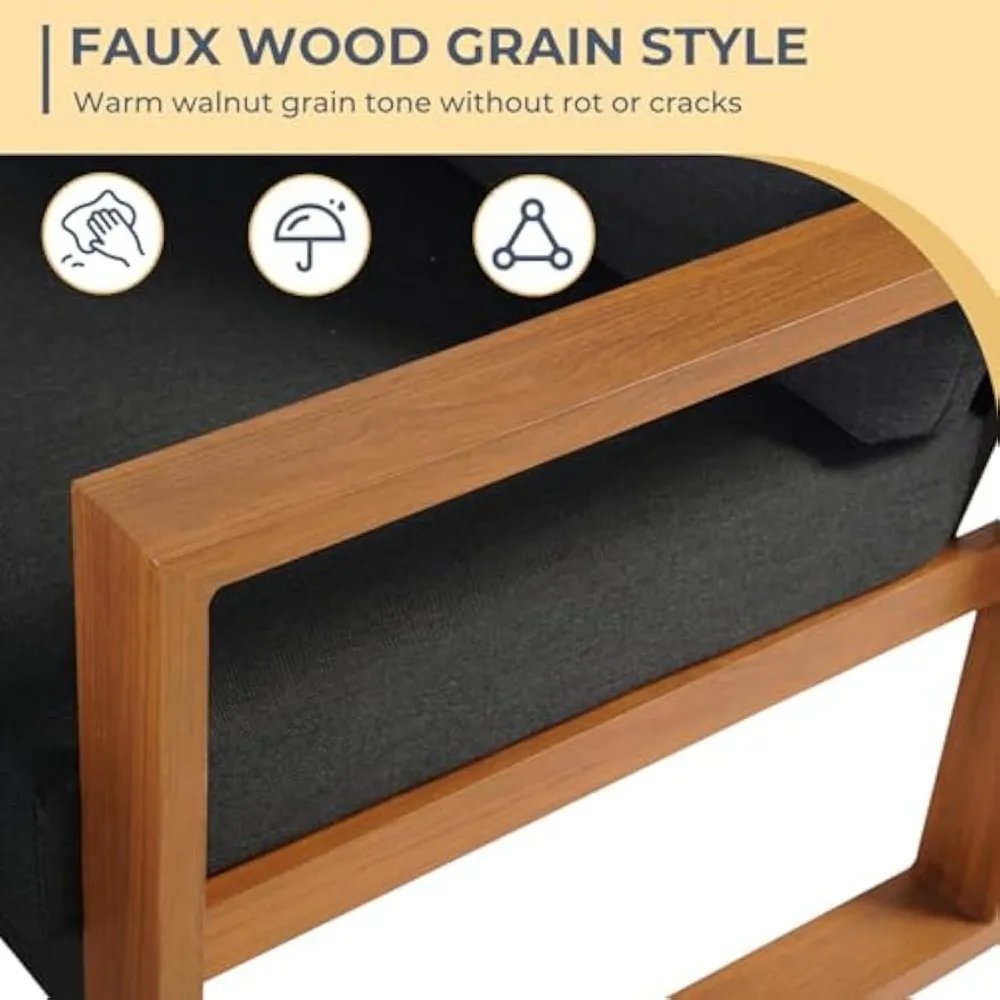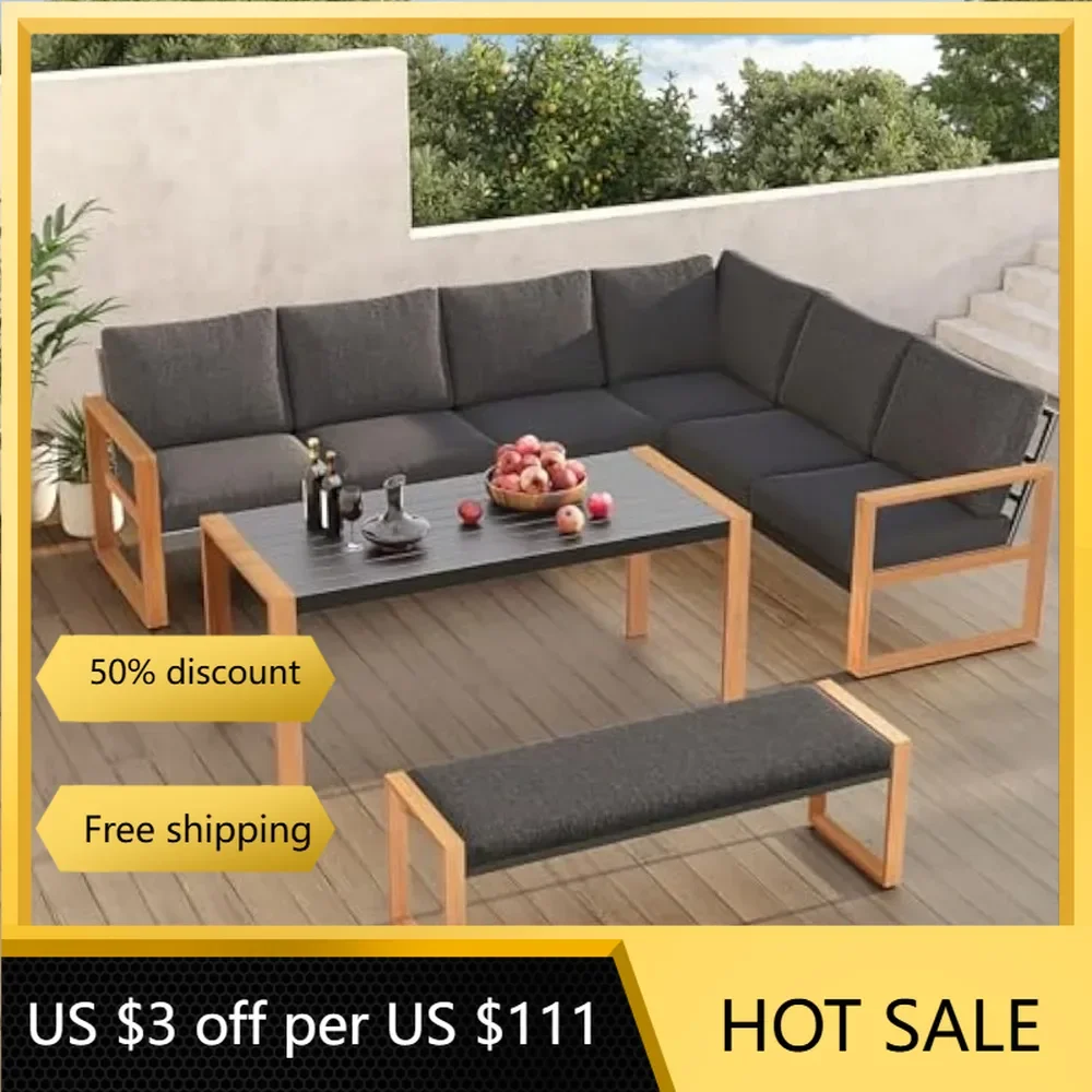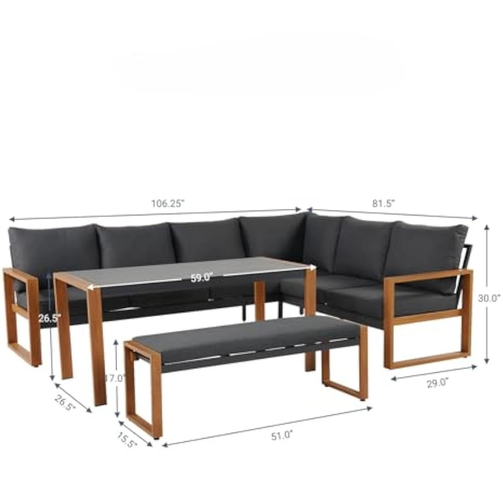 - Low Maintenance: This sectional sofa couch set features an all-aluminum construction with a powder-coated finish for great weather resistance. The legs utilize transfer printing technology to present a natural walnut wood grain texture, which can prevent rust and reduce maintenance costs