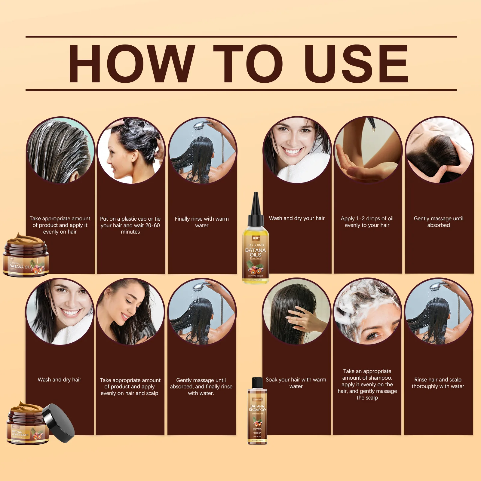 Jaysuing Hair Care Product Batana Oil Shampoo Conditioner Repair Split Ends Frizzy Damage Moisturize Smooth Shiny Keratin Hair Mask Serum
