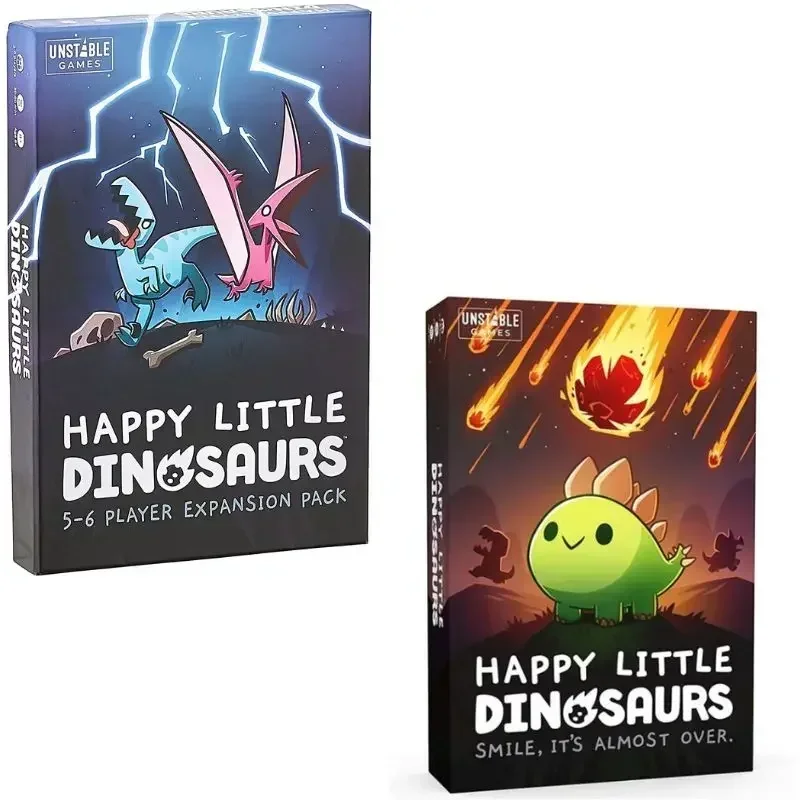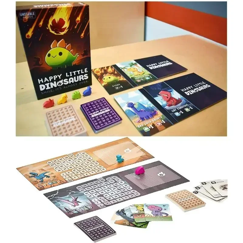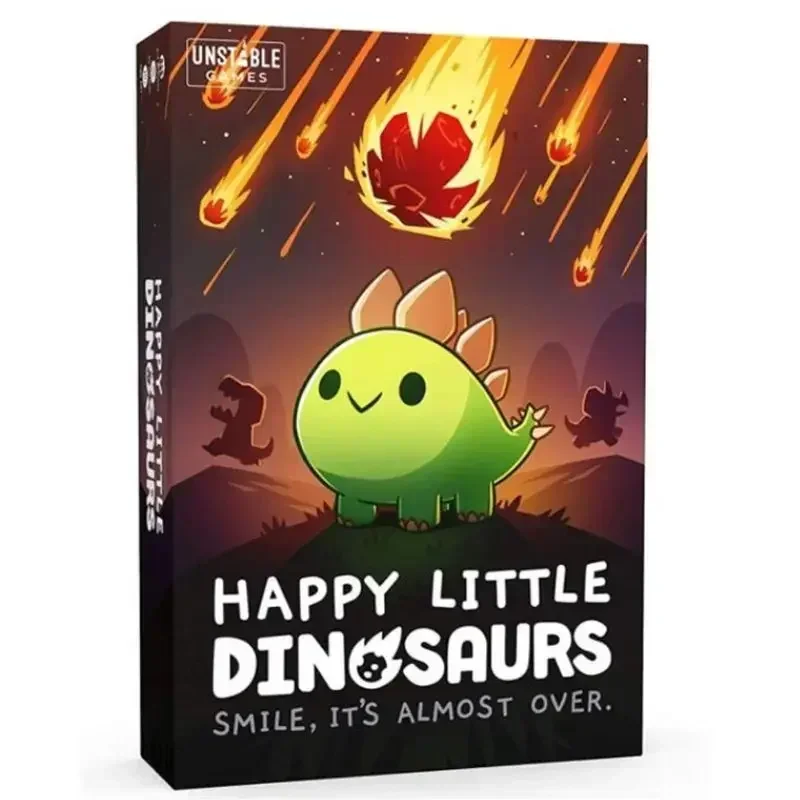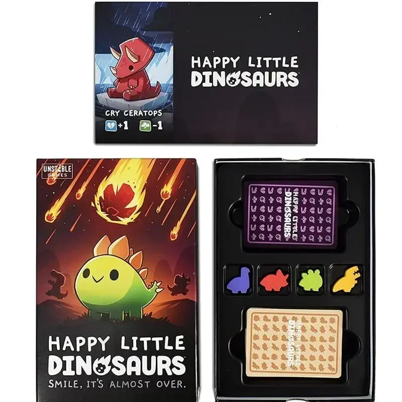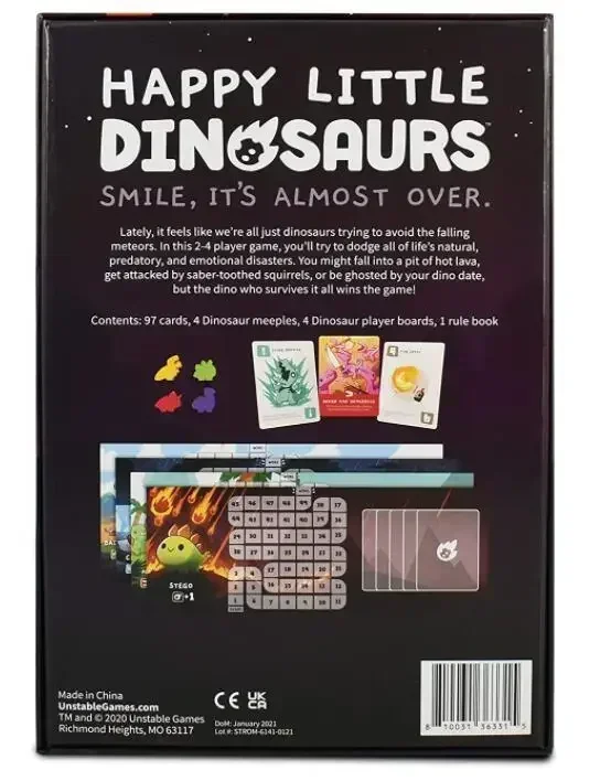 Lately, it feels like we're all just dinosaurs trying to avoid the falling meteors. In this 2-4 player game, you'll try to dodge all of life's little disasters. You might fall into a pit of hot lava or get ghosted by your dino date, but the dino who survives it all wins the game! Happy Little Dinosaurs takes 30-60 minutes to play and is for 2-4 players. It is recommended for ages 8+. The box contains 97 cards, 4 Dinosaur player boards, 4 Dinosaur meeples, and 1 rule book.