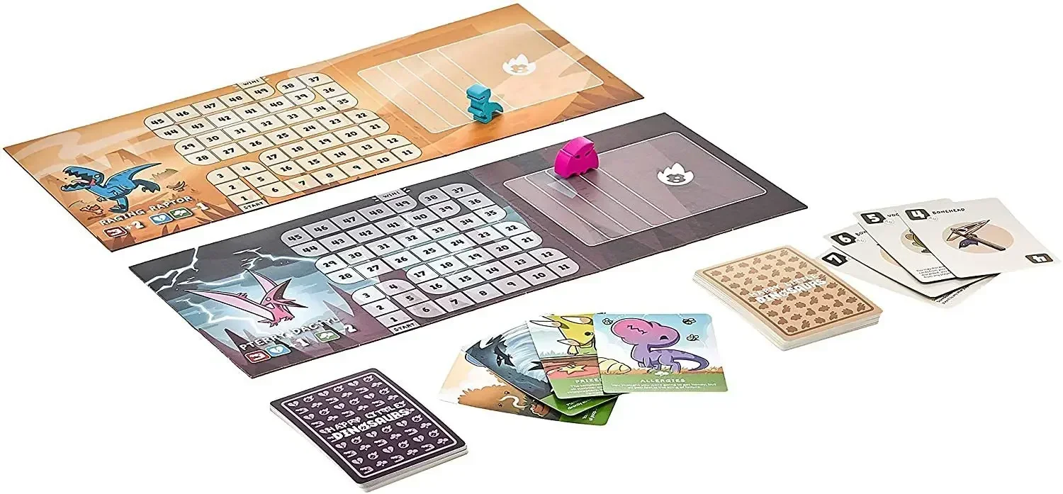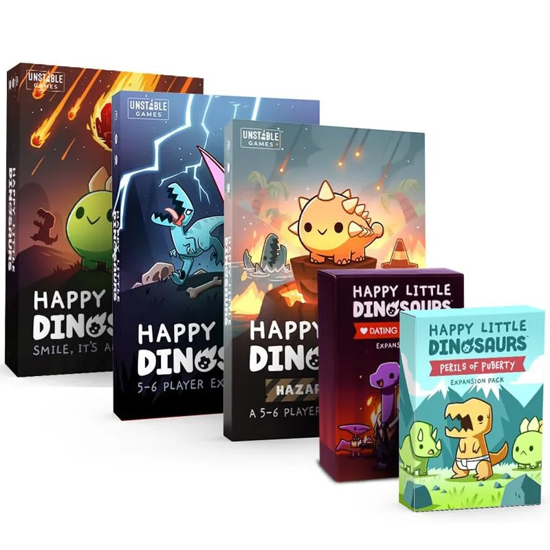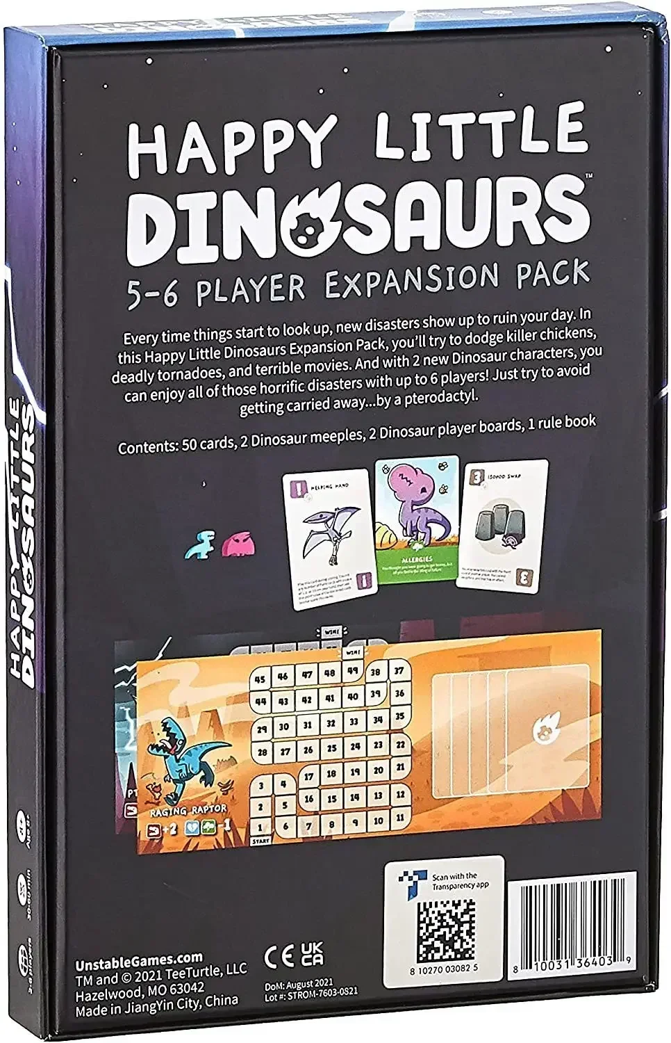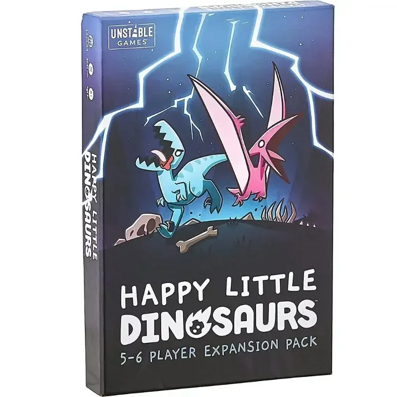 Lately, it feels like we're all just dinosaurs trying to avoid the falling meteors. In this 2-4 player game, you'll try to dodge all of life's little disasters. You might fall into a pit of hot lava or get ghosted by your dino date, but the dino who survives it all wins the game! Happy Little Dinosaurs takes 30-60 minutes to play and is for 2-4 players. It is recommended for ages 8+. The box contains 97 cards, 4 Dinosaur player boards, 4 Dinosaur meeples, and 1 rule book.