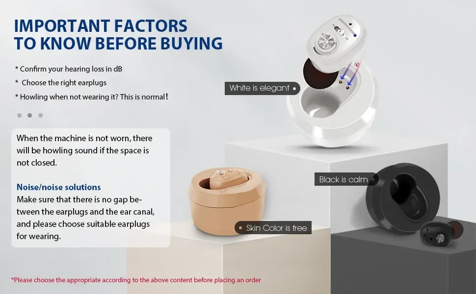 ●If the earmuffs are not completely inserted into the ear canal or the air leakage of the earmuffs will cause electrical noise, please don't worry,this is the smart chip is suppressing howling, just replace the larger earplugs.Turn off or lower the volume before inserting the instrument in your ear.