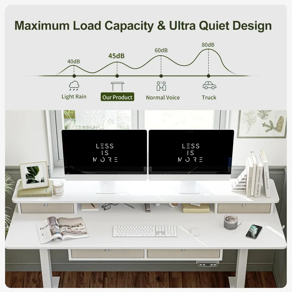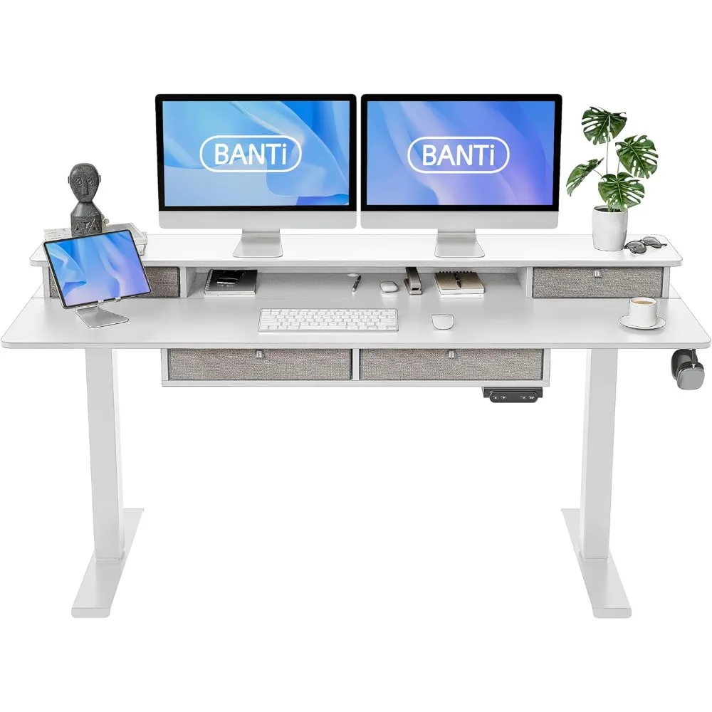 Home Store Desk organizers Height Adjustable Electric Standing Desk with 4 Drawers, 63 x 24 Inch Table with Storage Shelf, Sit Stand Desk, White Top