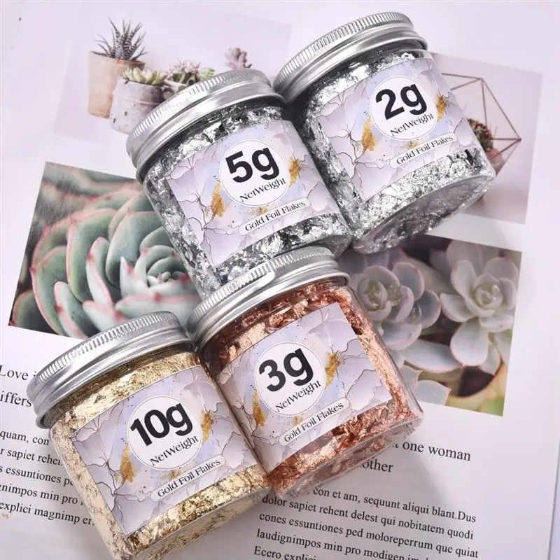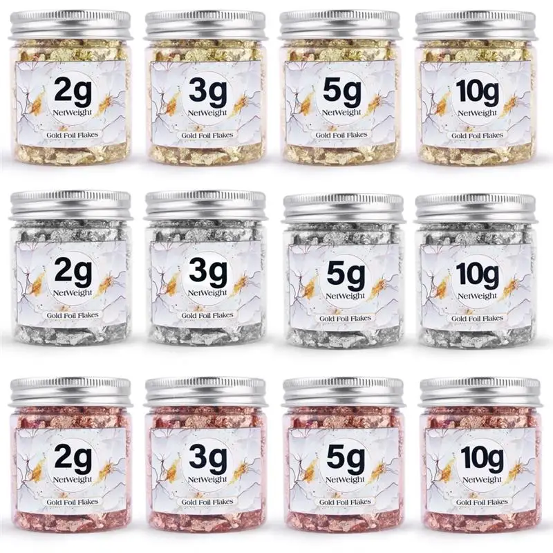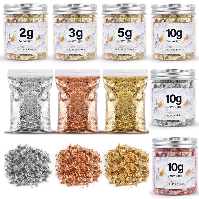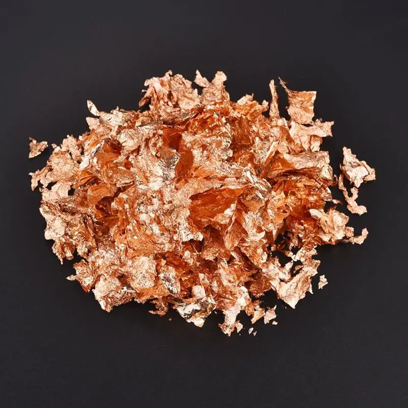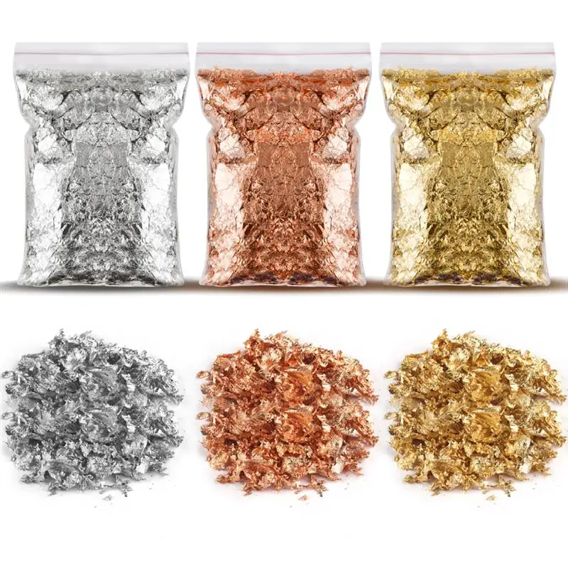Description: Imitation gold foil A great practical ingredient for food decoration. Ideal for gold, food lovers and a variety of artists. With gold, silver and copper colors, the gold foil flakes are not easy to fade and oxidize, they can create a stunning shiny textured effect to make your crafts look special. WIDE USES: The gold flakes for perfect for resin jewelry, acrylic painting, nail art, slime making, photo frame and other crafts paste. WARM TIPS: These metallic foil flakes is non-edible. Material: Imitation Gold foil Weight: 1/2/3/5/10g