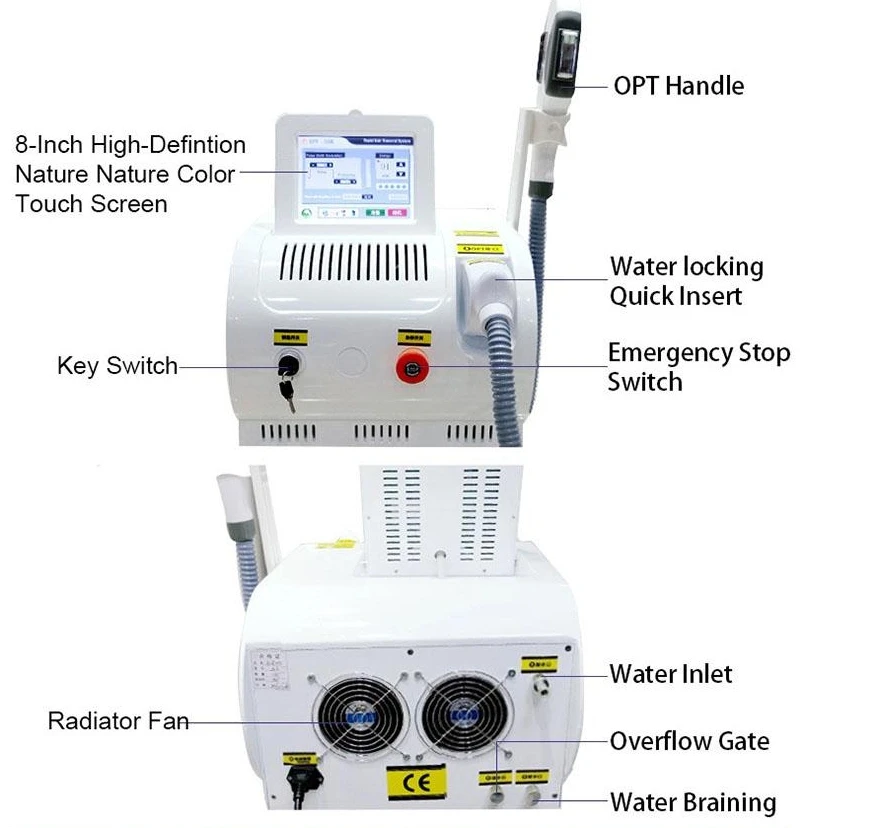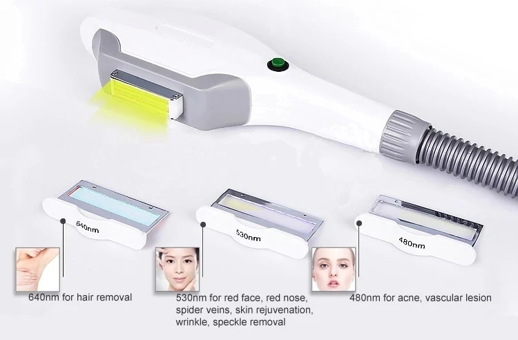 IPL OPT beauty machine, used for salon grade permanent hair removal and skin regeneration, with 3 tips and OEM tongue blades