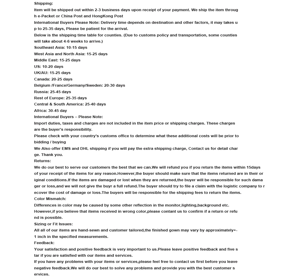 4.The expected delivery date will be affected by customs, weather etc, sometimes it may take a little longer to receive,Please contact us when you have not received the package to extend your order protection time.