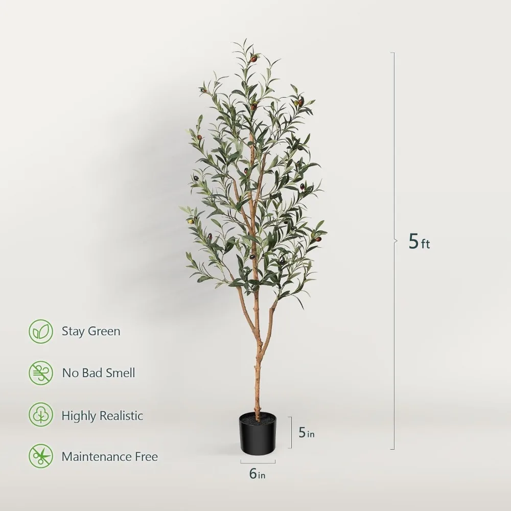 Kazeila Artificial Olive Tree 5FT Tall Faux Silk Plant for Home Office Decor Indoor Fake Potted Tree with Natural Wood Trunk and