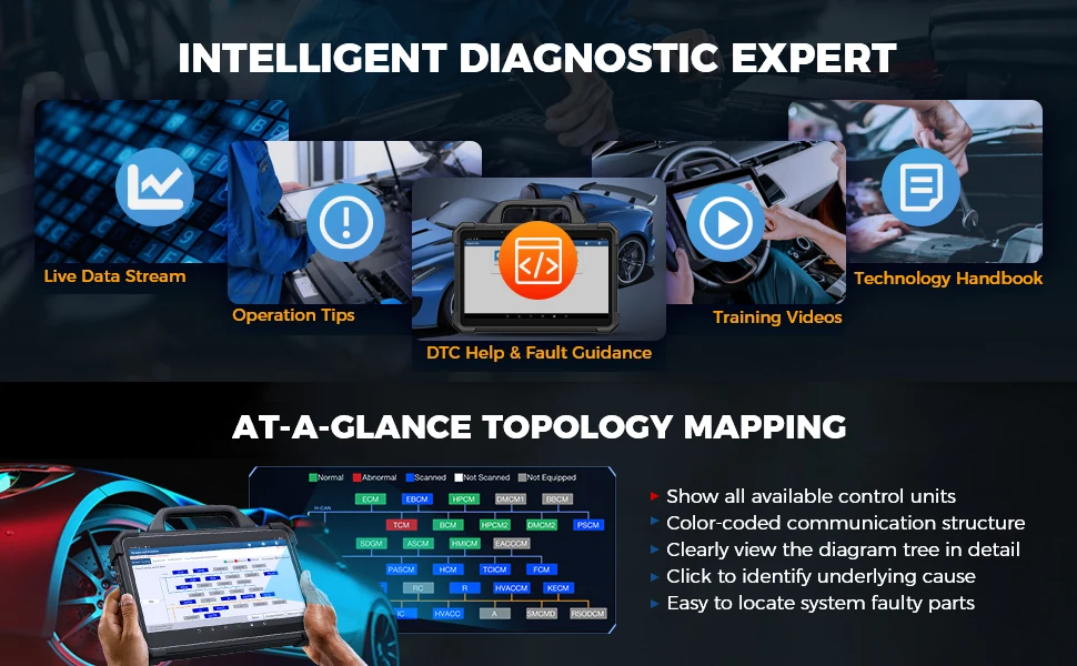 The Smart Topology Module Mapping in this diagnostic tool allows you to directly view the color-coded topology display for all communication structures between vehicle modules, and click to check the fault code, saving the hassle of toggling menus back and forth to find what you want.