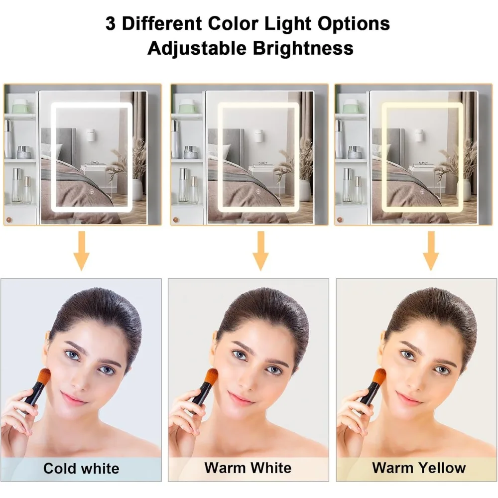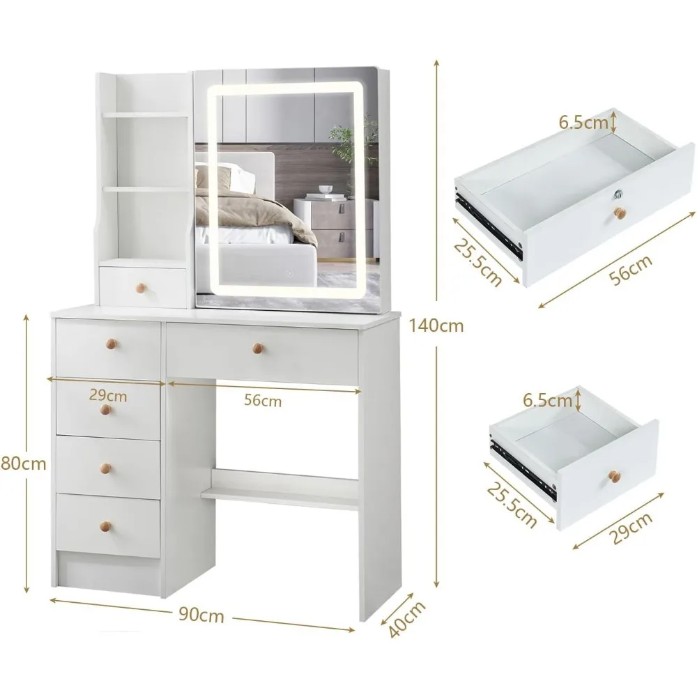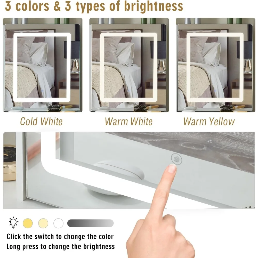 - 【LED Sliding Mirror】This mirror is large and high-definition, giving you a great view for applying makeup or styling your hair. And the mirror is designed as a sliding door, making the back of the mirror a hidden storage space, where some personal items can be placed, making the vanity table look more clean and tidy.